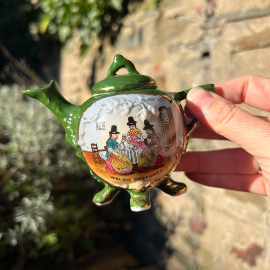 Miniature Green Teapot - Welsh Costumes - Antique Souvenir (Preloved)