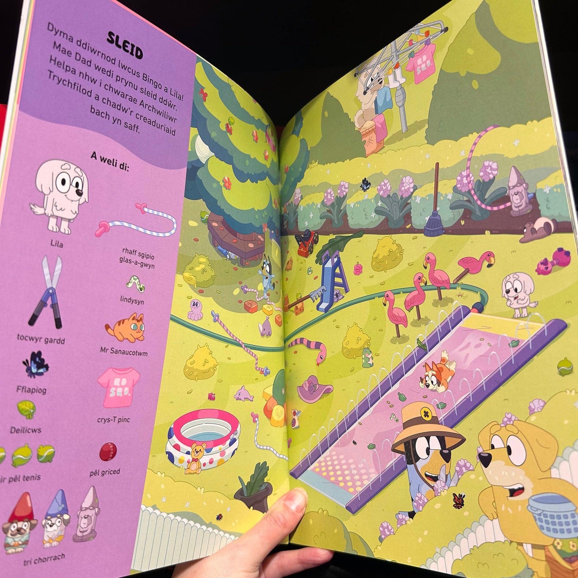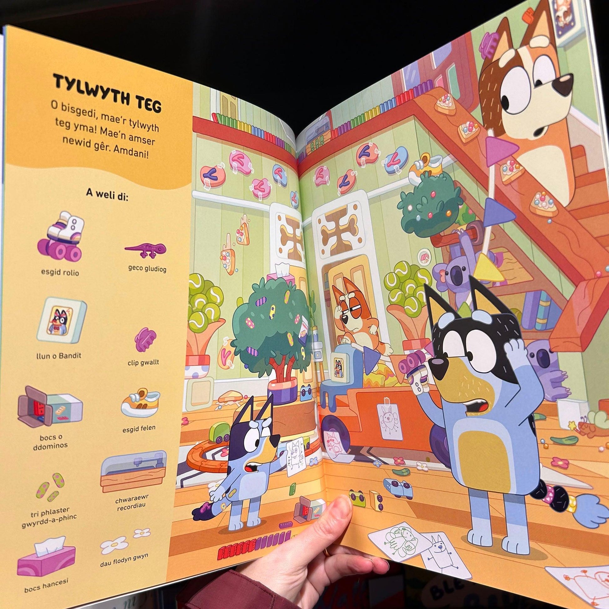 Cadwch lygad allan am y plant bach! Dewch o hyd i Bluey yn y cwpwrdd bach sydd wedi cwympo ac ymunwch â'r chwiliad am Bingo a Coco yn y fferyllfa! Tybed y gallwch chi helpu'r neiniau i ddod o hyd i'r bargeinion cudd yn y gwerthiant garej? Gyda 14 o olygfeydd gwych a dros 180 o eitemau i'w gweld, mae'n llawn hwyl chwilio a chanfod! Mae hon yn ffordd wych o ddysgu geiriau cyntaf a'i throi'n gêm gyda'ch rhai bach!