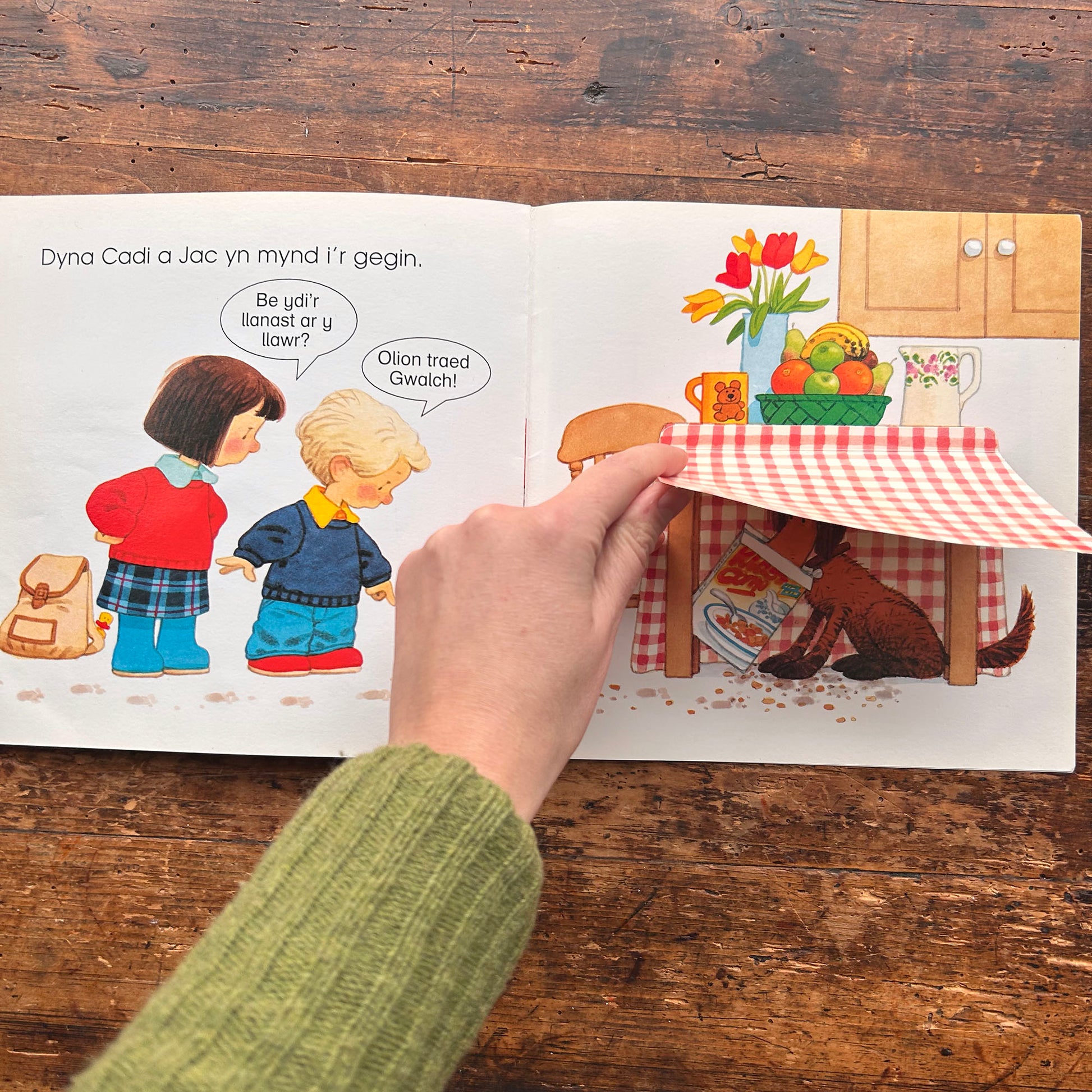 A very hard to find Welsh adaptation of one of Heather Amery's popular lift-the-flap books about the children searching for their dog as they wander around the farm, illustrated by Stephen Cartwright (spot the little ducks!)
