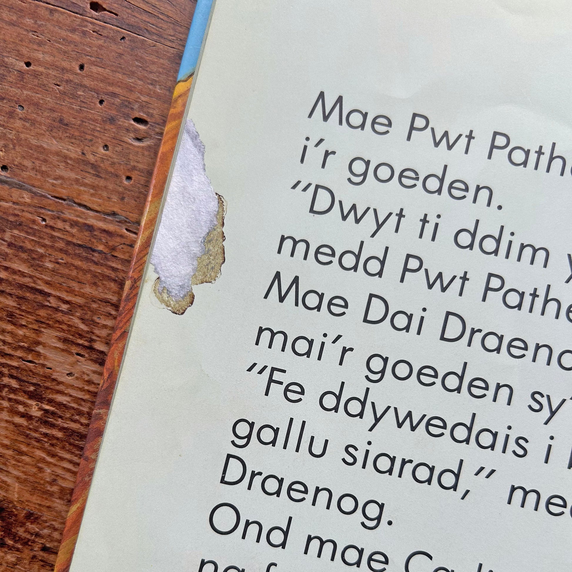 Cyflwr: da mae gan rai tudalennau ychydig o ddifrod (yn y llun) ond nid yw hyn yn effeithio ar ddarllen y llyfr