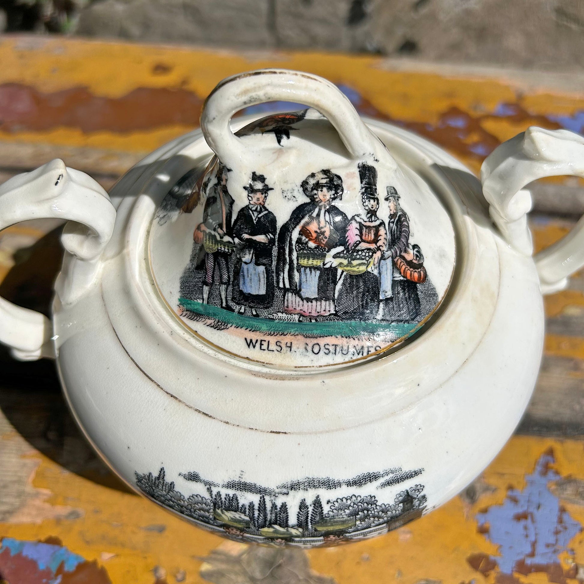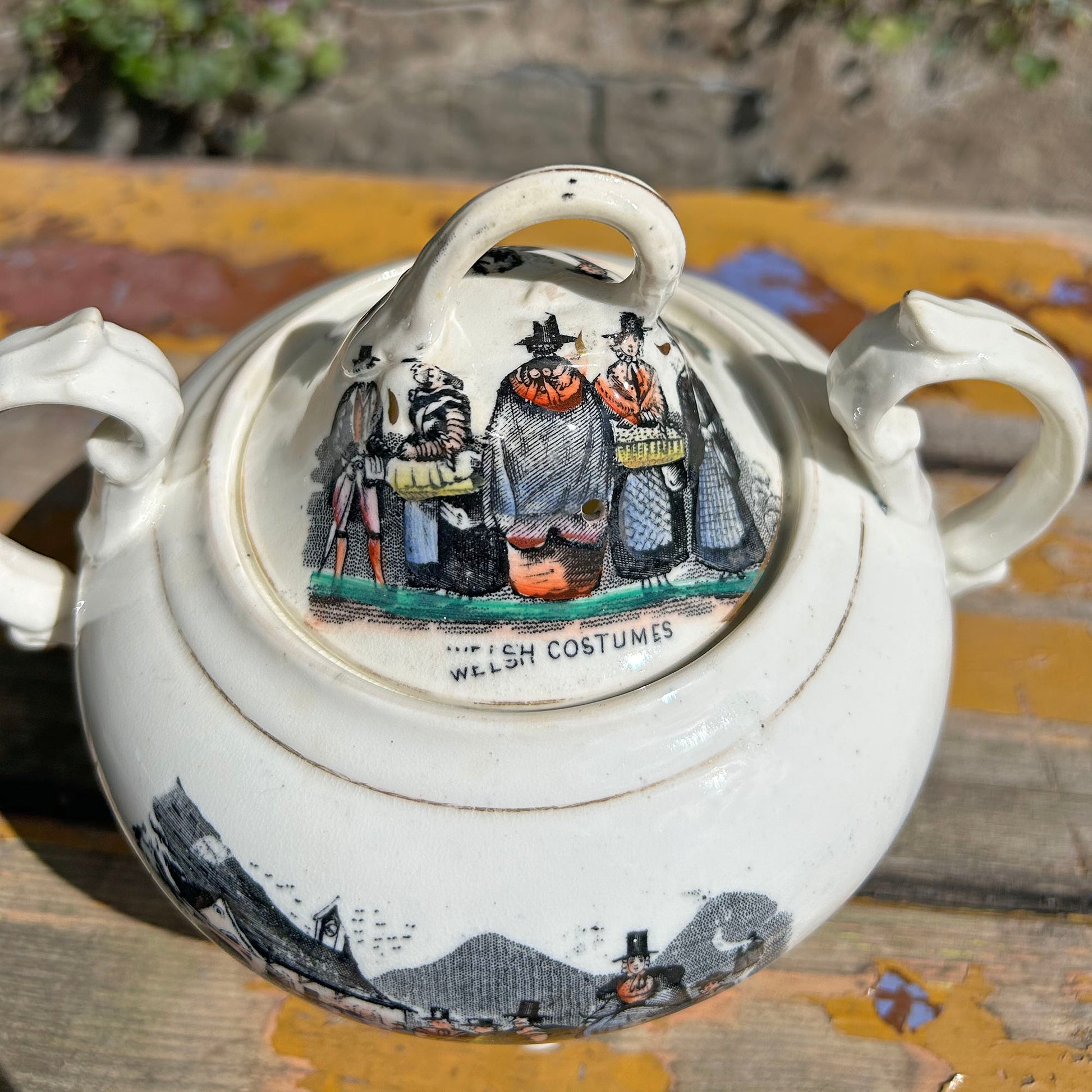 - Jwg Gwisgoedd Cymreig swynol yn arddangos dwy olygfa brysur o’r farchnad yng Nghymru (delwedd wahanol ar bob ochr)