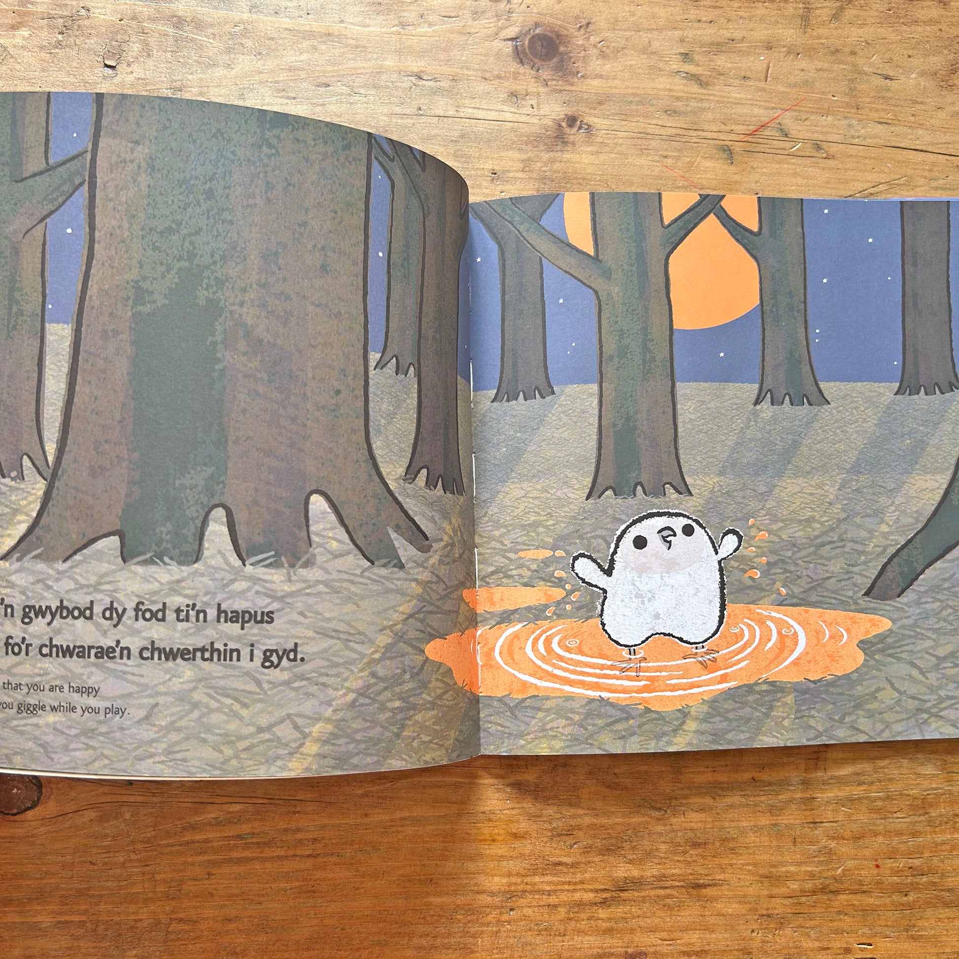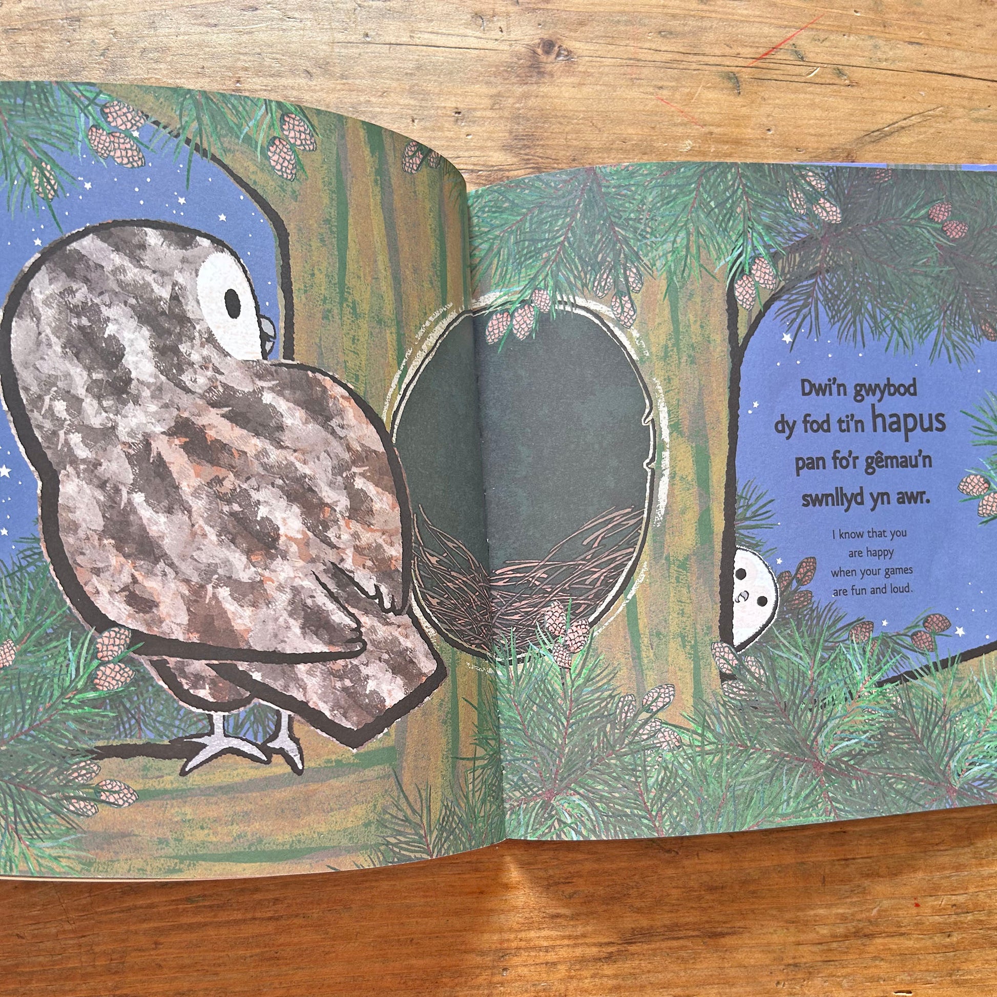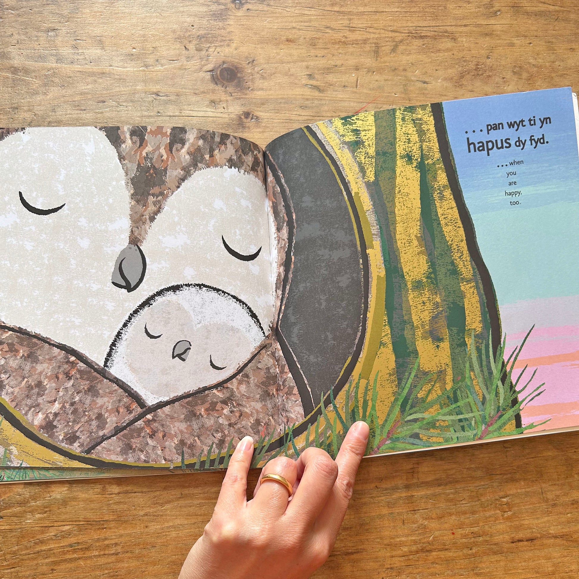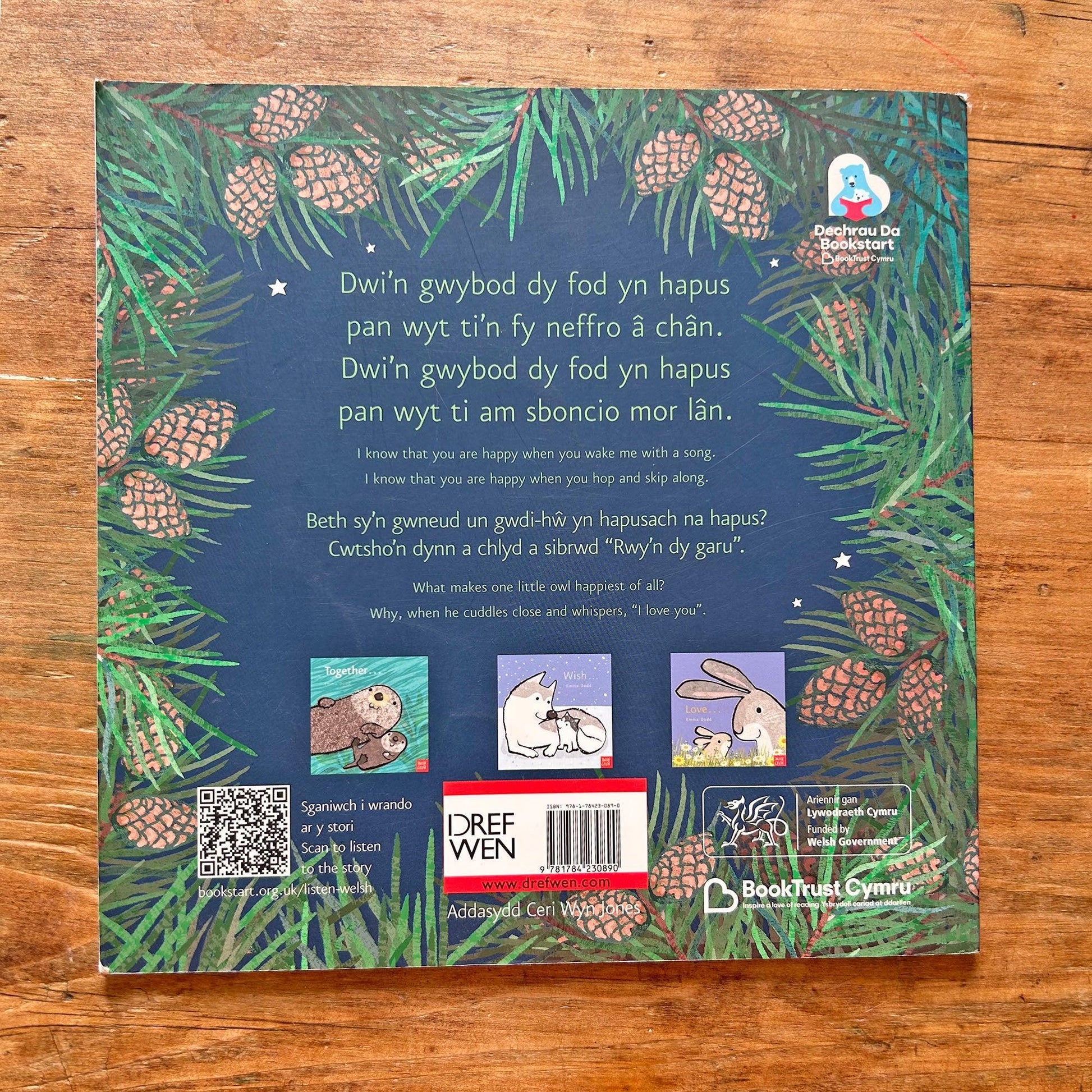 Beth sy'n gwneud un dylluan fach hapusaf o'r cyfan? Pam, pan mae'n cwtsio'n agos ac yn sibrwd, Rwy'n dy garu di. Addasiad Cymraeg gan Ceri Wyn Jones o destun Emma Dodd y mae hi wedi'i ddarlunio'n swynol.