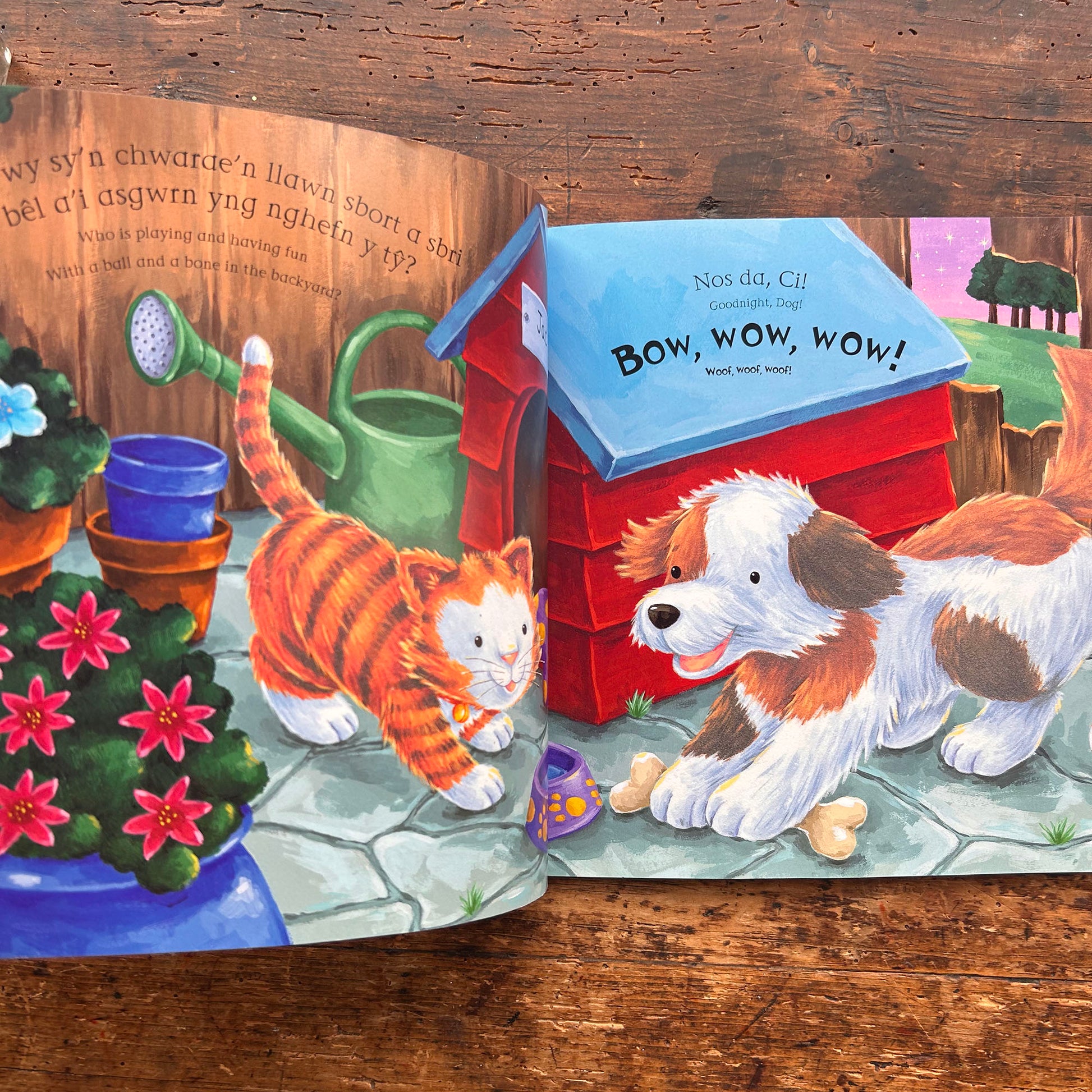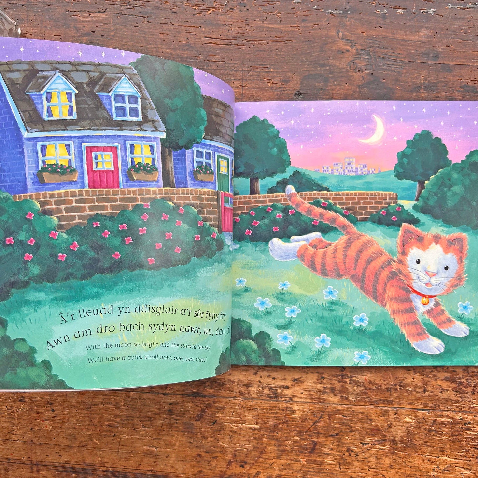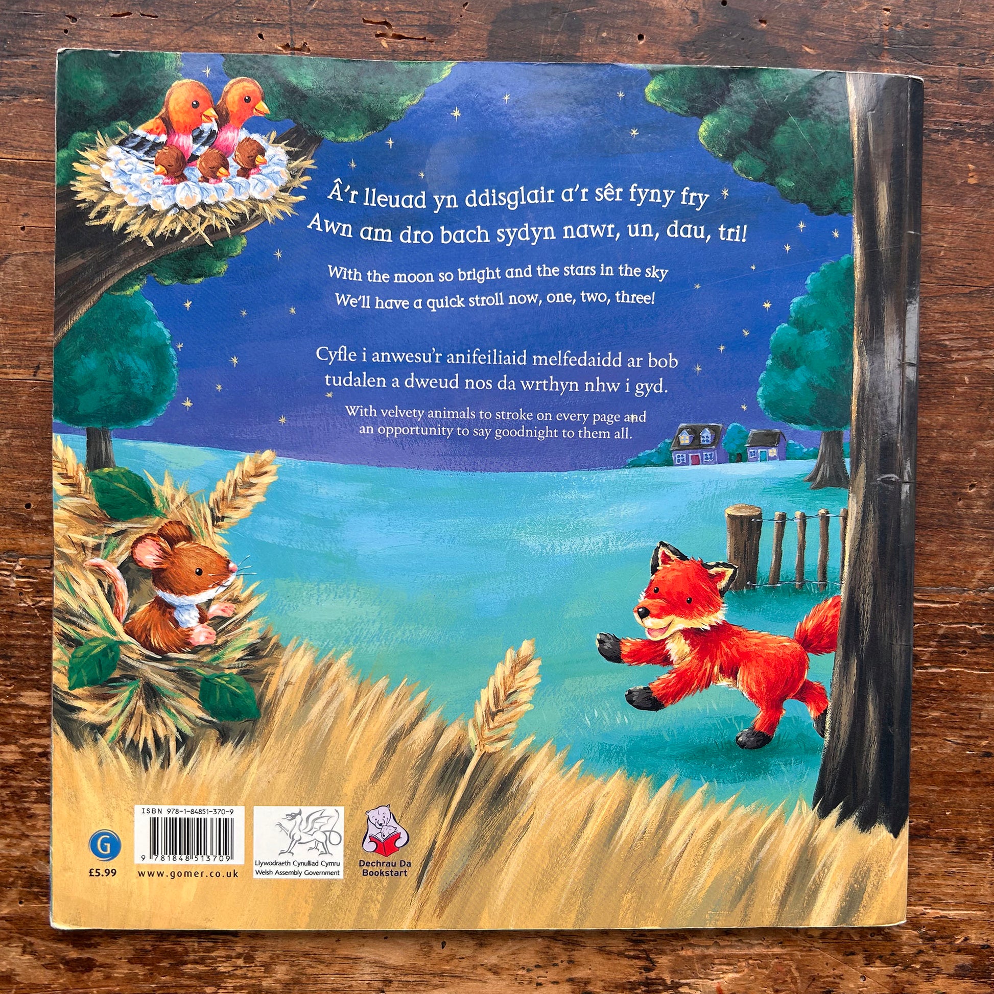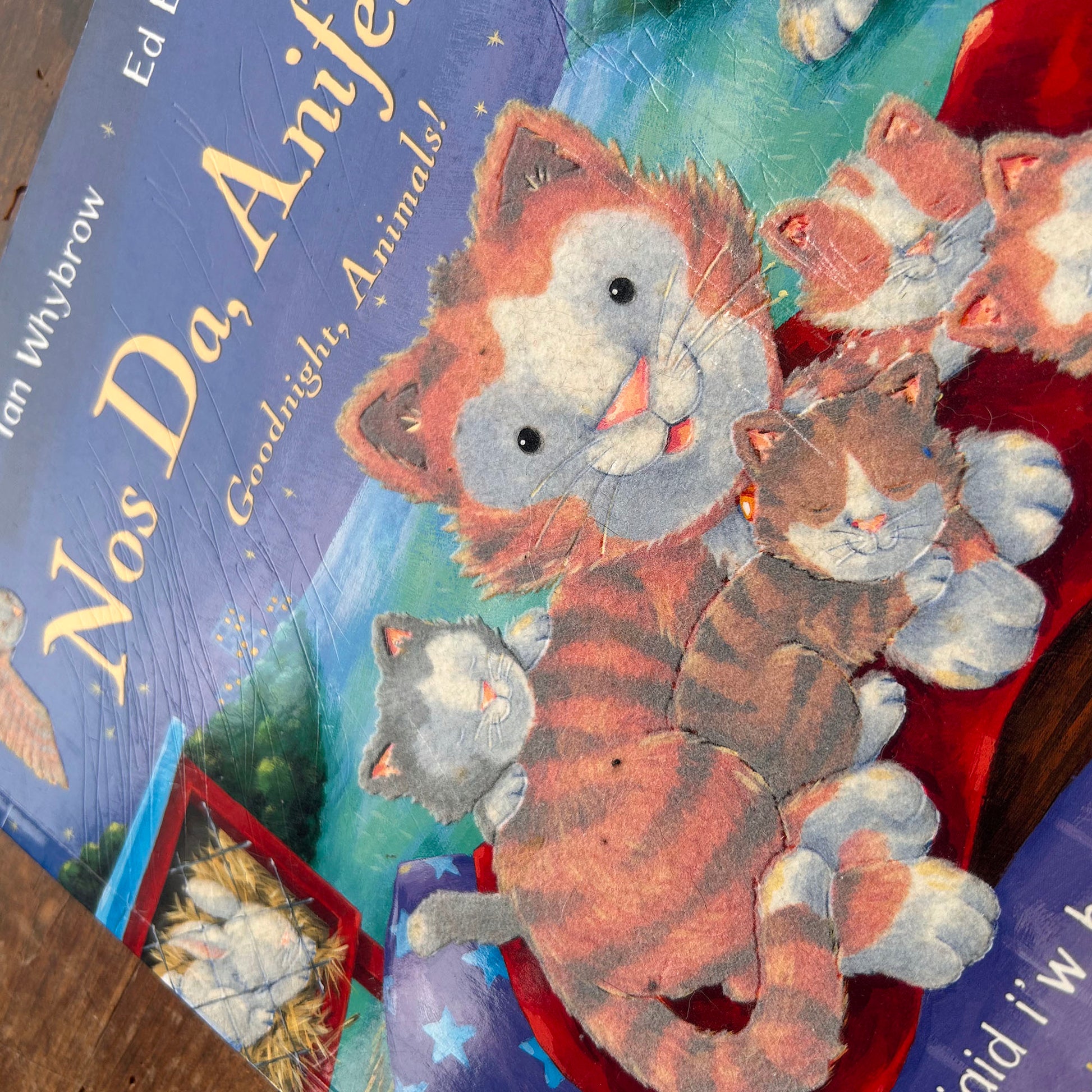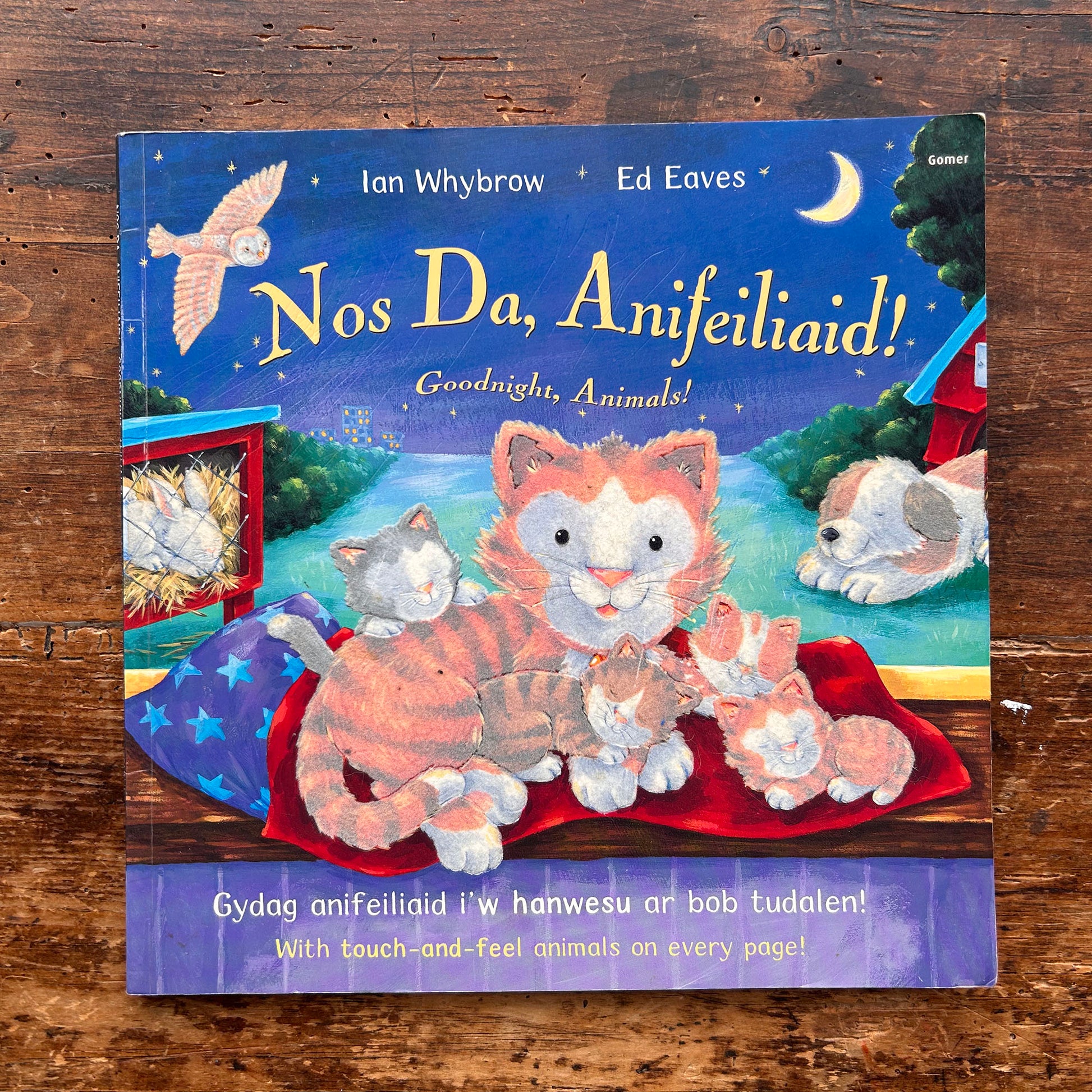Delightful bilingual children's book by Ian Whybrow and Ed Eaves, featuring a cat saying goodnight to various animals with soft velvety animals to touch-and-feel throughout