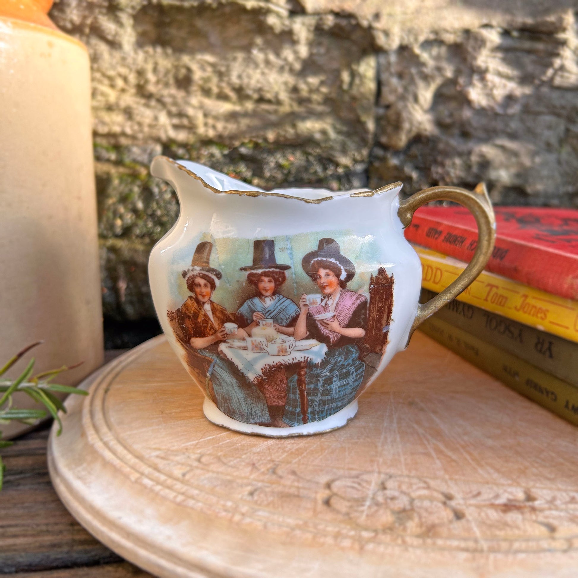 • Jwg Gwisgoedd Cymreig swynol yn arddangos triawd o Ferched Cymreig yn mwynhau 'Parti Nyddu'