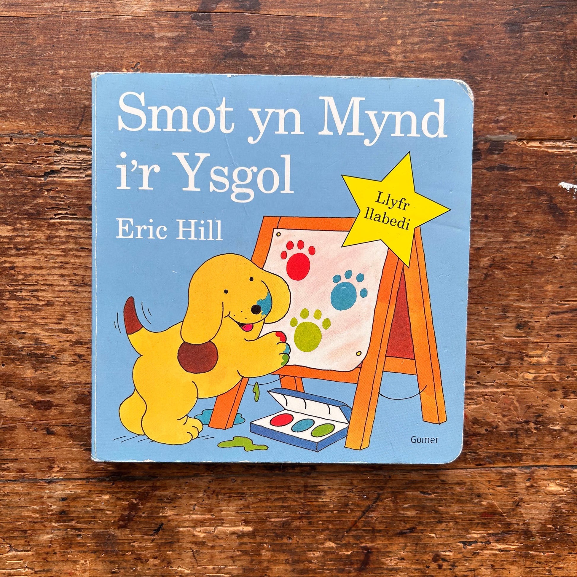 A colourful book in the Spot the Dog series by Eric Hill for younge children, translated into Welsh by Dilwen M. Evans. It was a lift the flap book but these have been mostly torn out - but still a lovely tale of Spot.