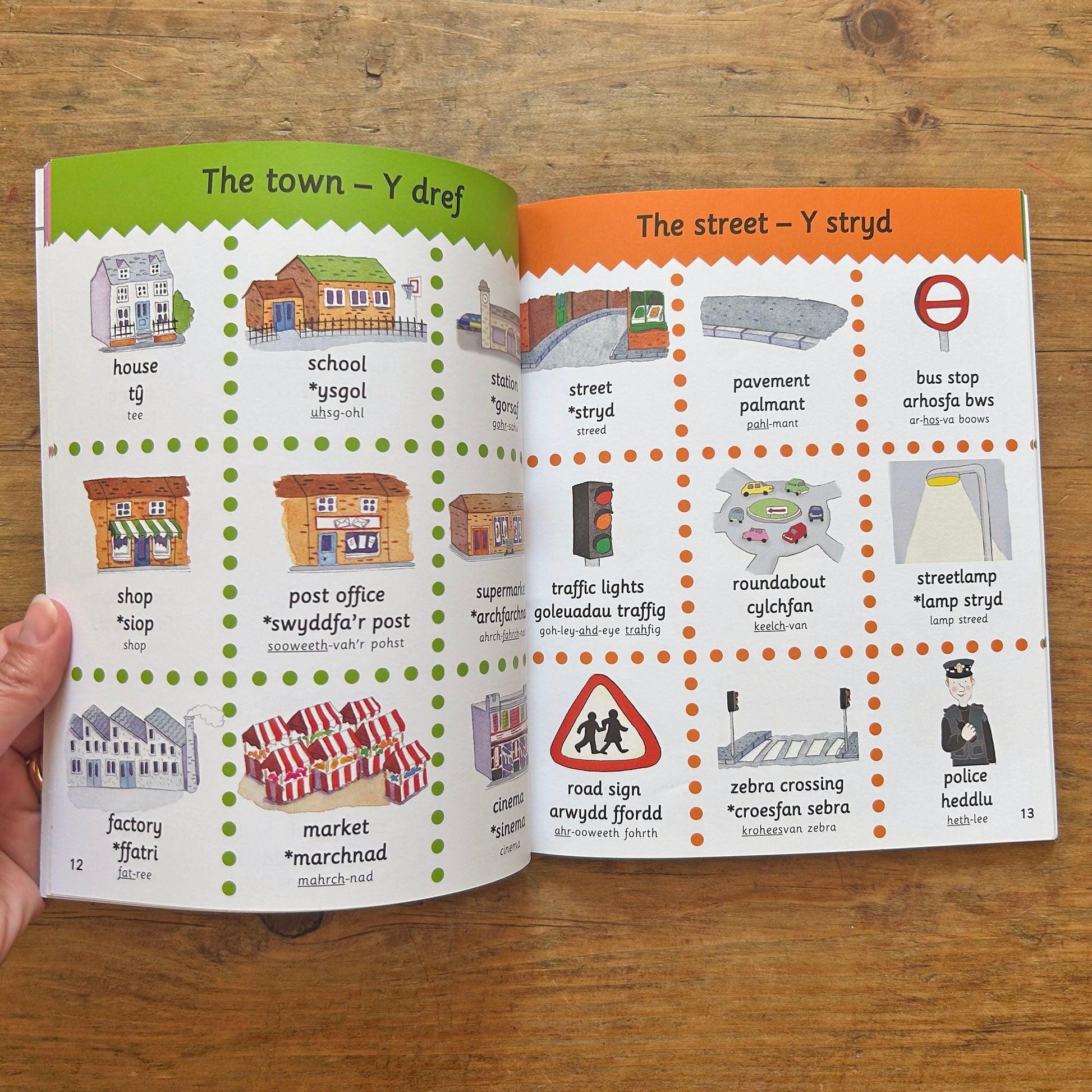 Geiriadur gwych gyda dros 350 o ddarluniau o wrthrychau cyfarwydd. Mae pob llun wedi'i labelu â'r gair Saesneg, ac yna'r gair cyfatebol Cymraeg. Mae'r gair wedi'i gyfieithu yn cael ei ddilyn yn ei dro gan sillafiad ffonetig mewn print llai. Mae geiriau wedi'u grwpio yn ôl themâu, fel chwaraeon, ystafell ddosbarth, ffrwythau, llysiau, amser parti, tywydd, a llawer o rai eraill.