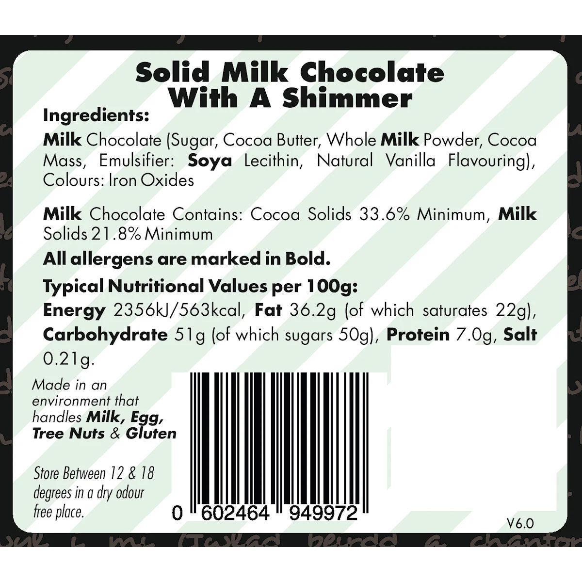 Milk Chocolate (Sugar, Cocoa Butter, Whole Milk Powder, Cocoa Mass, Emulsitier: Soya Lecithin, Natural Vanilla Flavouring), Colours: Iron Oxides