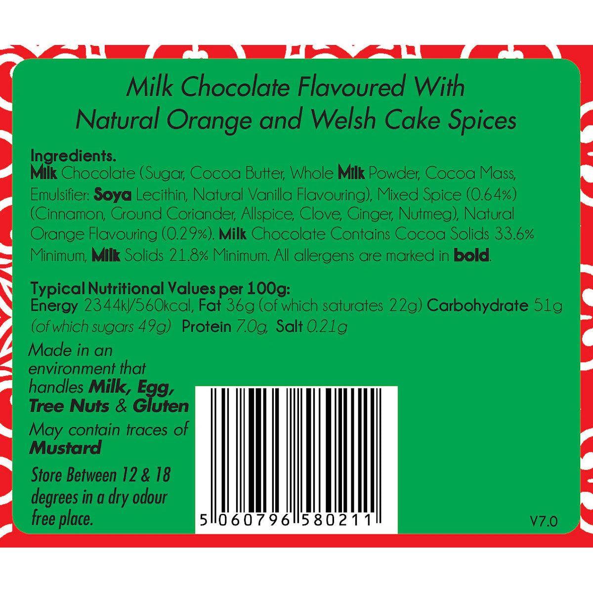 Milk Chocolate (Sugar, Cocoa Butter, Whole Milk Powder, Cocoa Mass, Emulsifier: Soya Lecithin, Natural Vanilla Flavouring), Mixed Spice (0.64%) (Cinnamon, Ground Coriander, Allspice, Clove, Ginger, Nutmeg), Natural Orange Flavouring (0.29%).