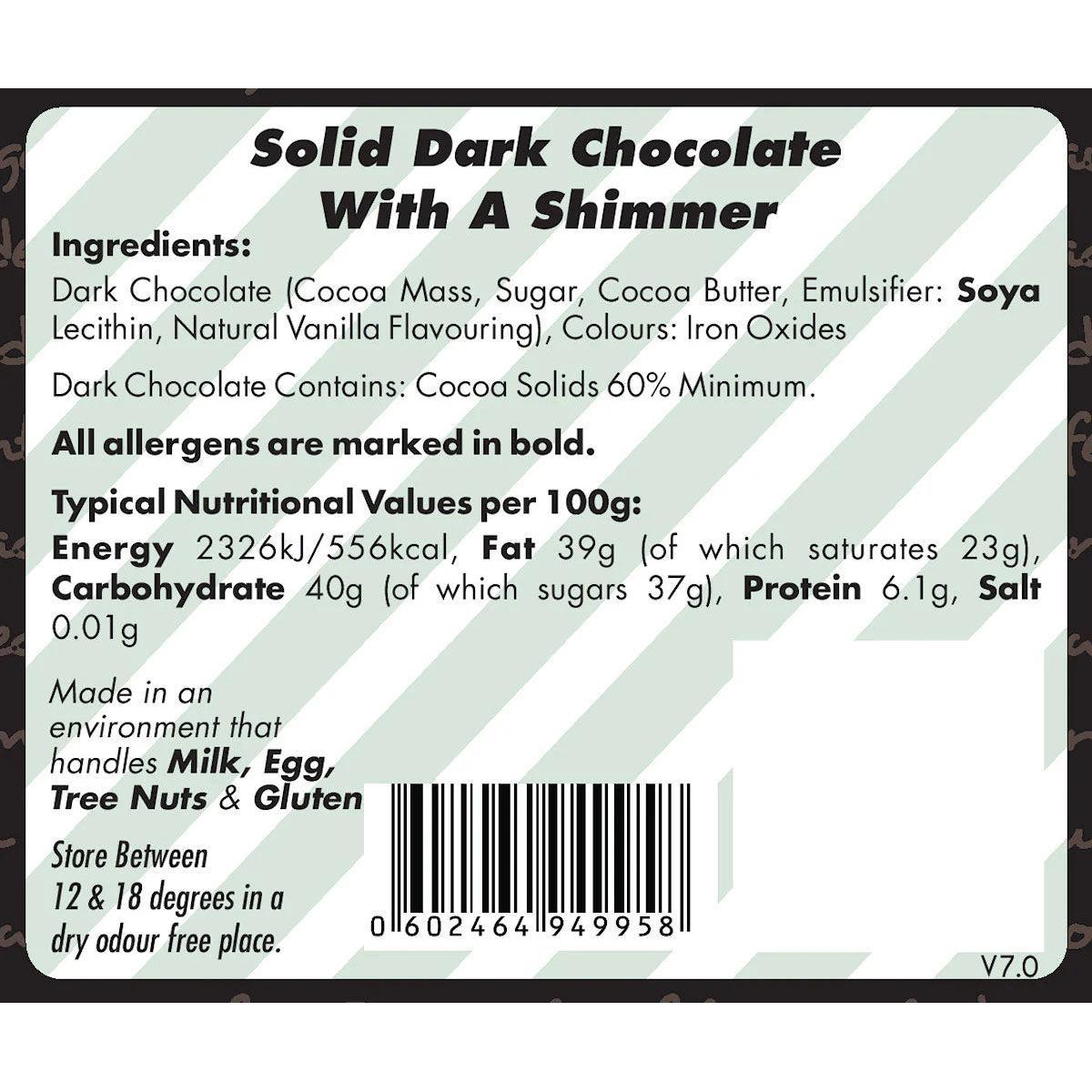 Dark Chocolate (Cocoa Mass, Sugar, Cocoa Butter, Emulsifier: Soya Lecithin, Natural Vanilla Flavouring), Colours: Iron Oxides
