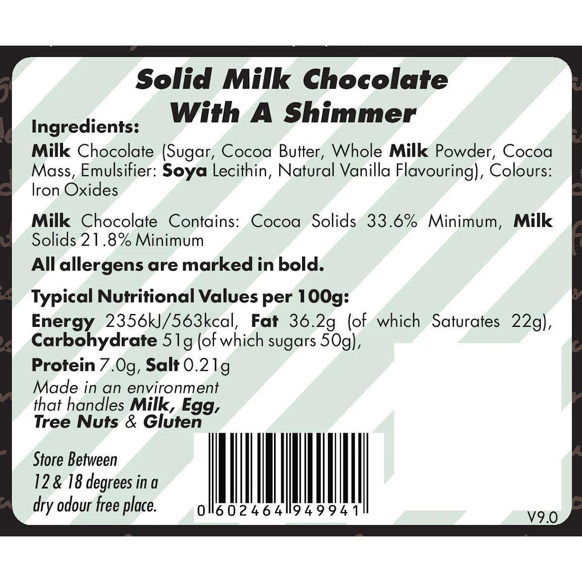 Milk Chocolate (Sugar, Cocoa Butter, Whole Milk Powder, Cocoa Mass, Emulsitier: Soya Lecithin, Natural Vanilla Flavouring), Colours: Iron Oxides