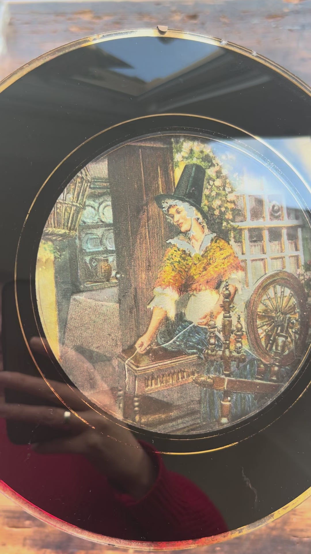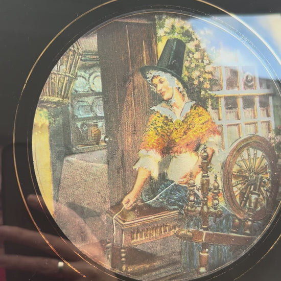 - The centre features a reproduction of a Victorian-style painting, showing a woman in 19th-century dress with a spinning wheel and rustic interior scene