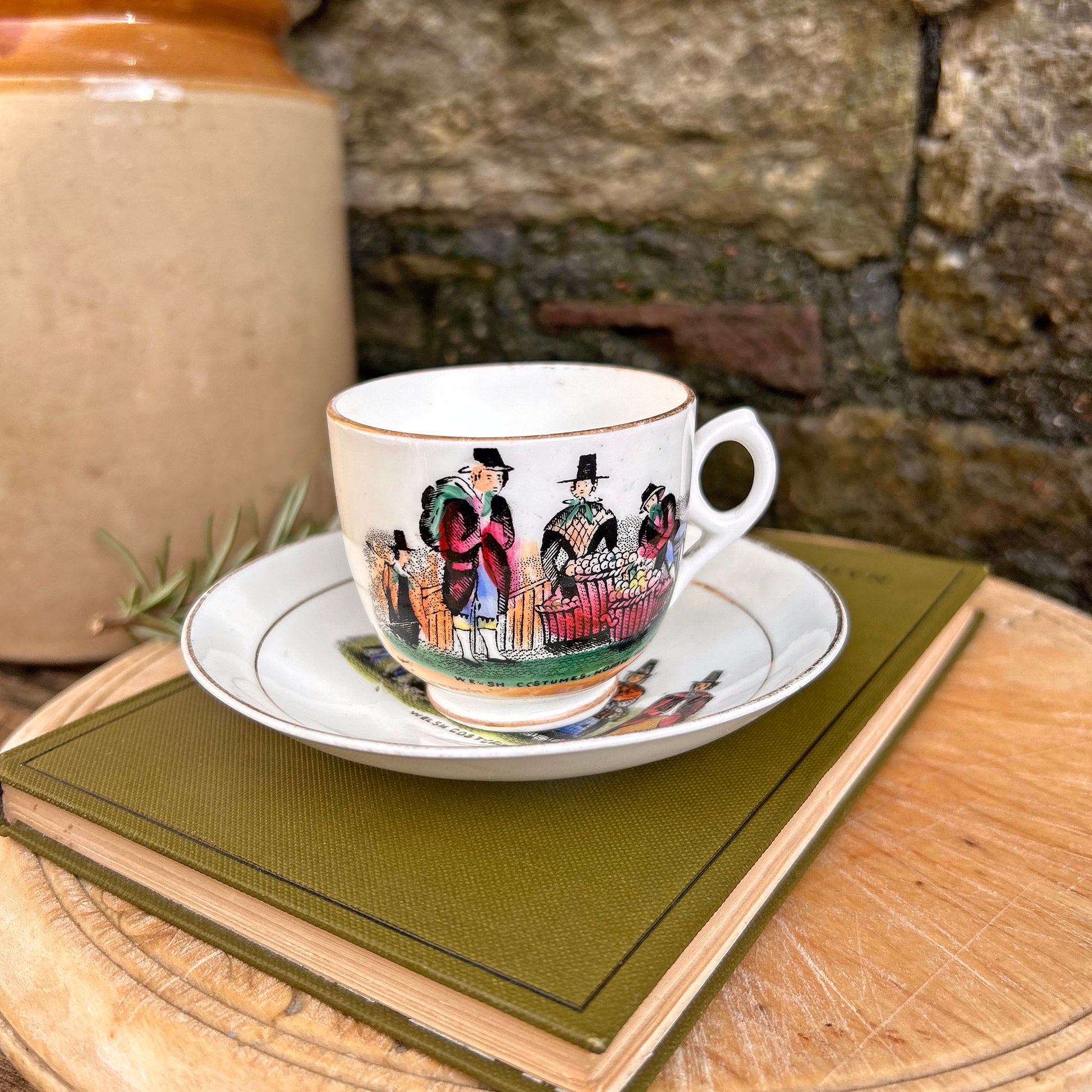 - Small Welsh Costume tea set displaying Welsh ladies and men at market and off to market