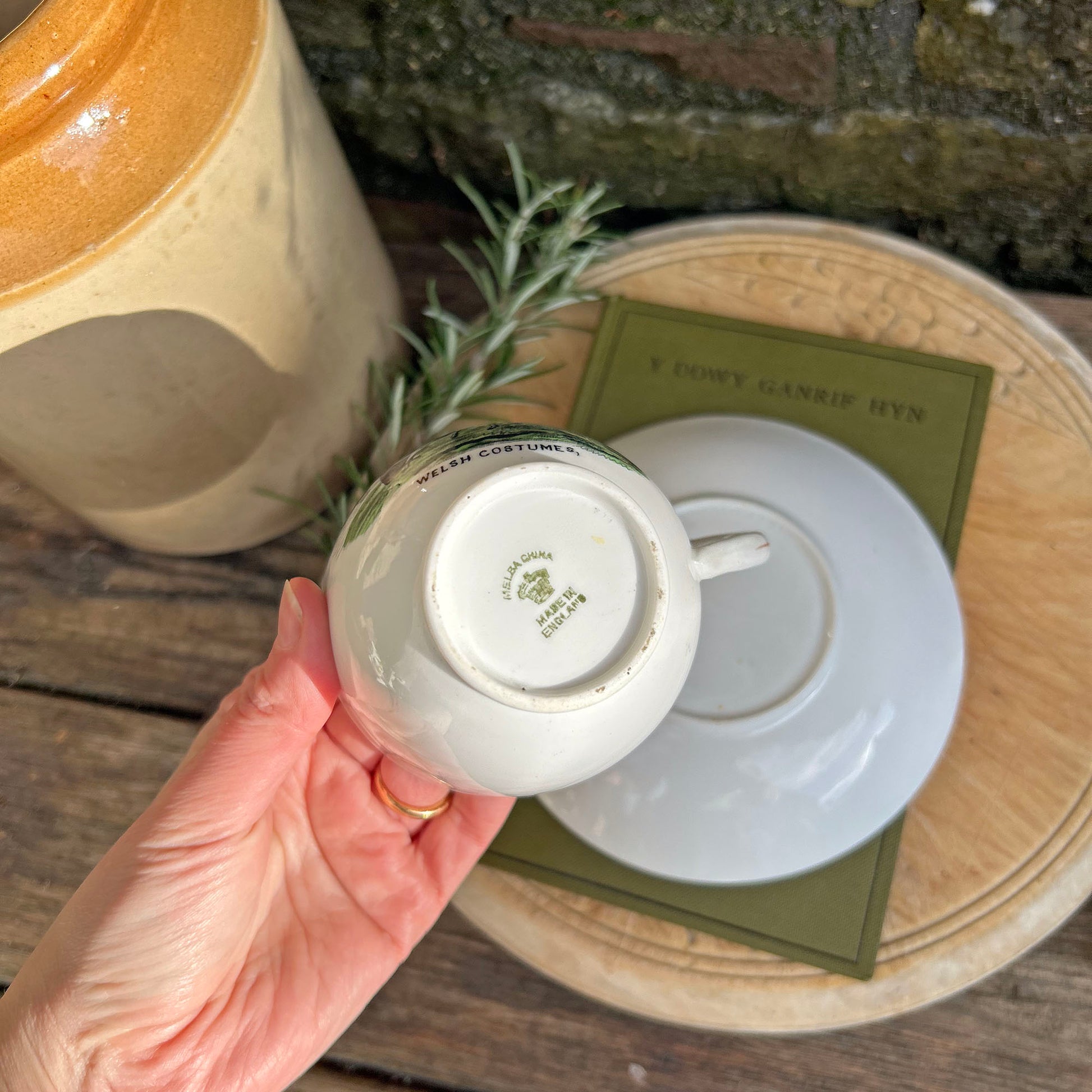 - Welsh Costume tea set displaying Welsh ladies off to market on horseback and at the market with their wares.