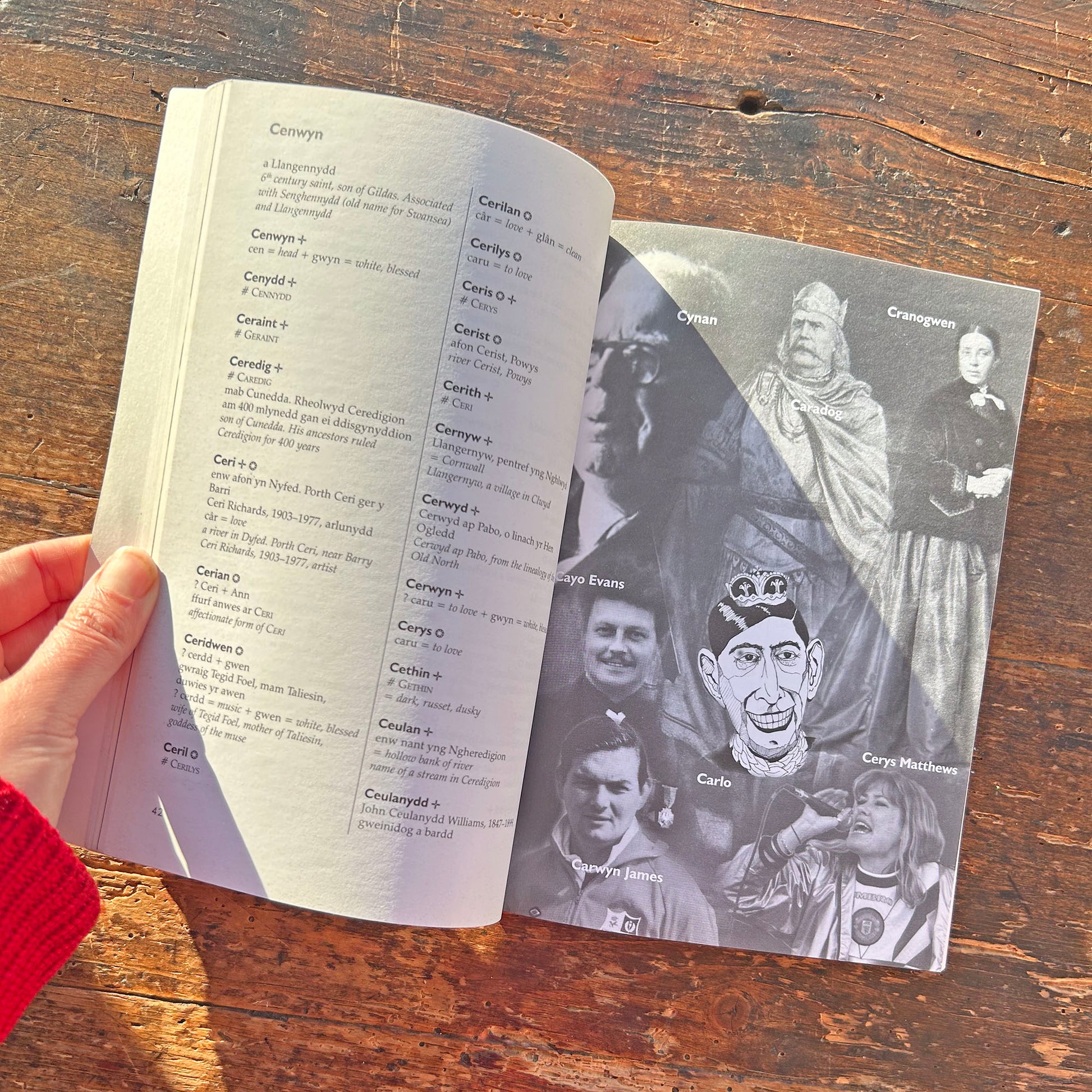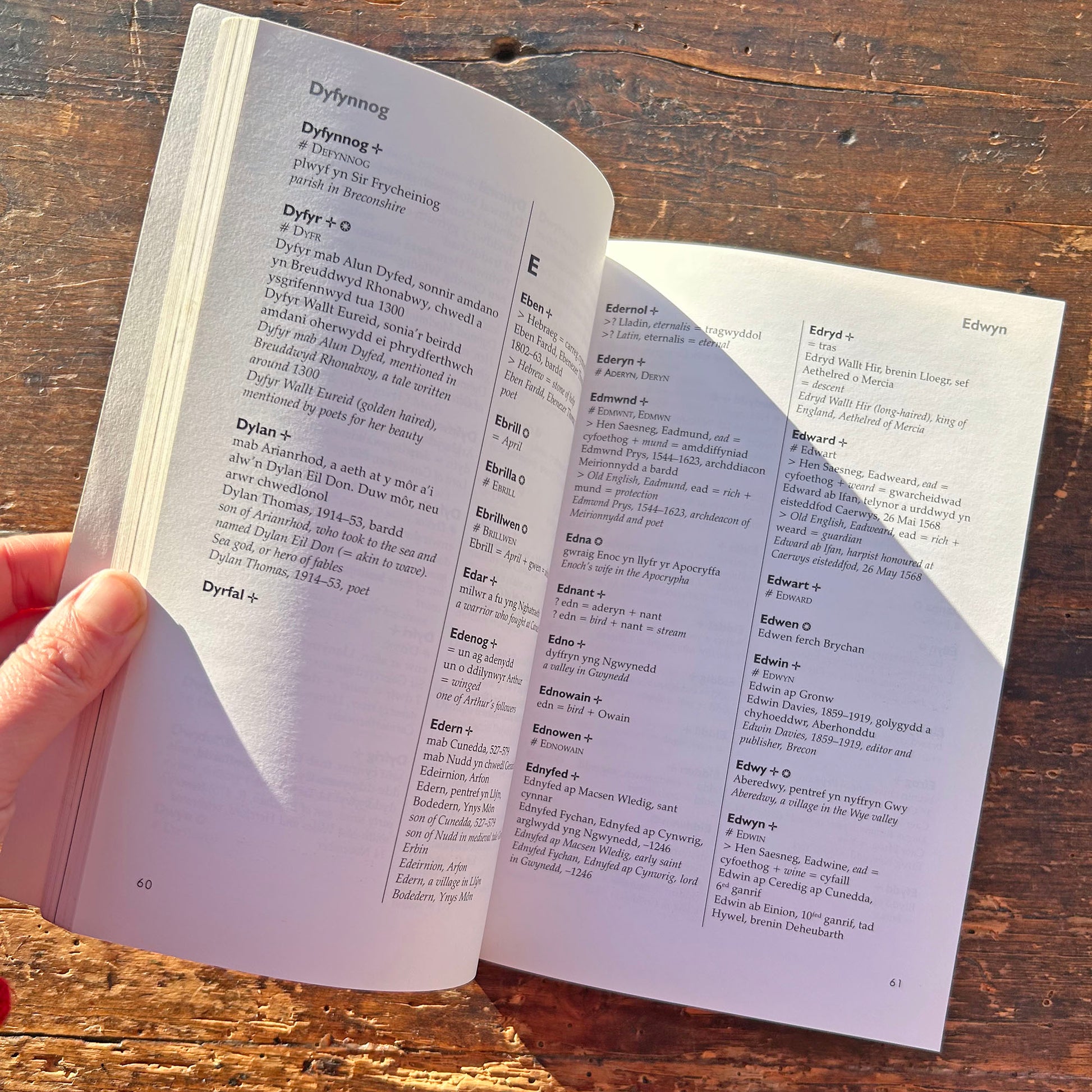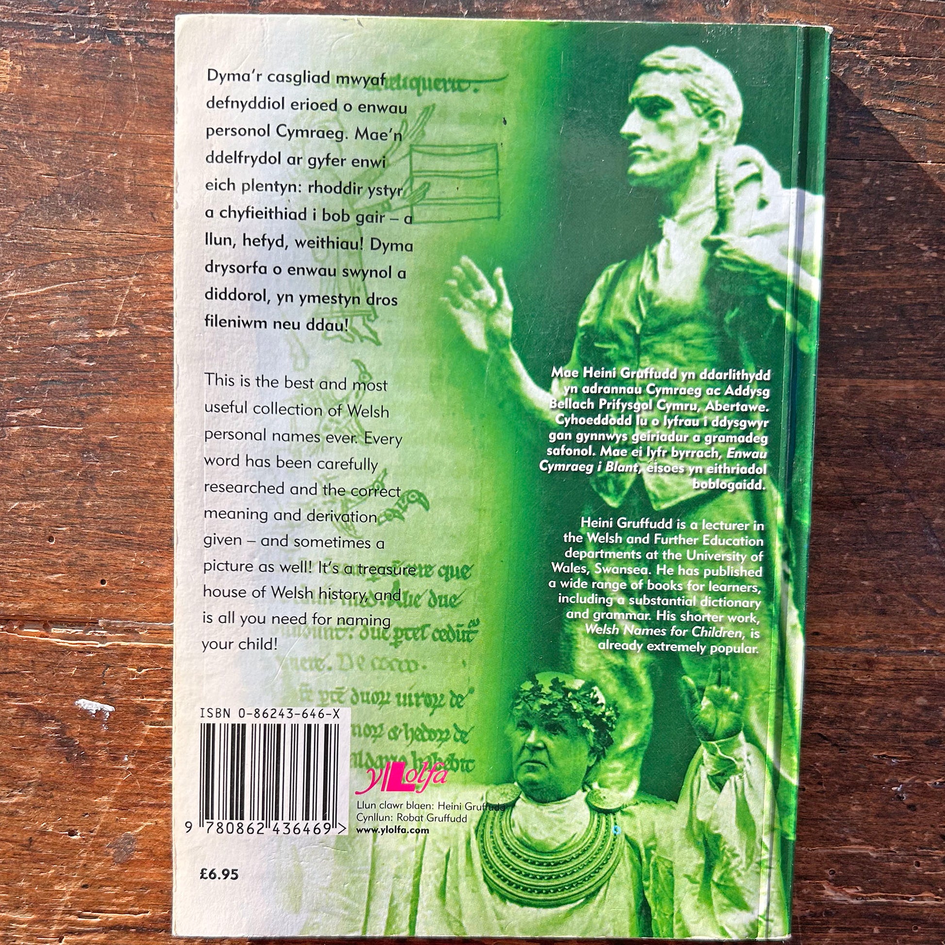 A guide of suitable 21st-century Welsh names. It is bilingual, and includes a detailed description of each name's origin, and a list of famous namesakes through the centuries. It also includes pictures of famous Welshmen - from Macsen Wledig (Magnus Maximus) to Dylan Thomas. The book features names connected with an area or geographical feature, or with nature, Welsh literature, folktales and religions past and present. It aims to assist new parents in the difficult task of naming their baby.