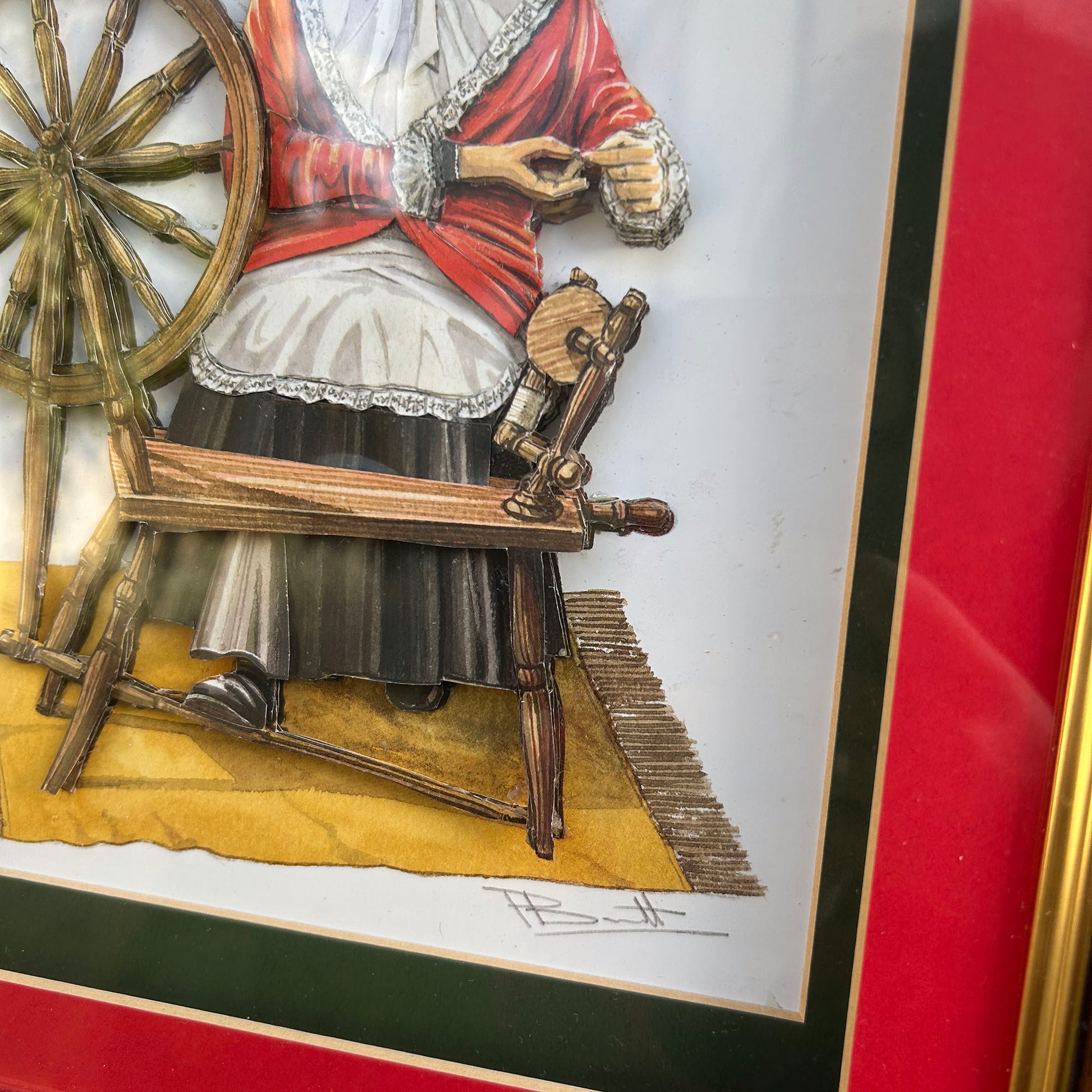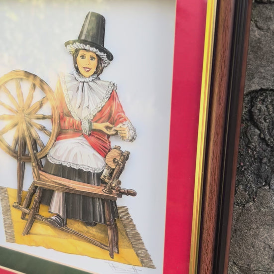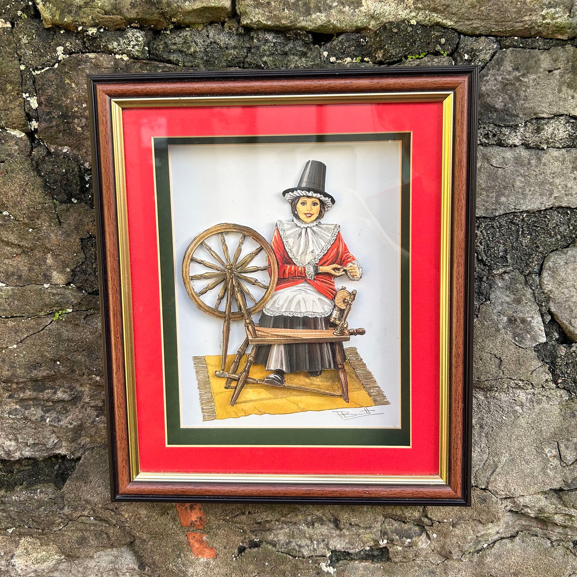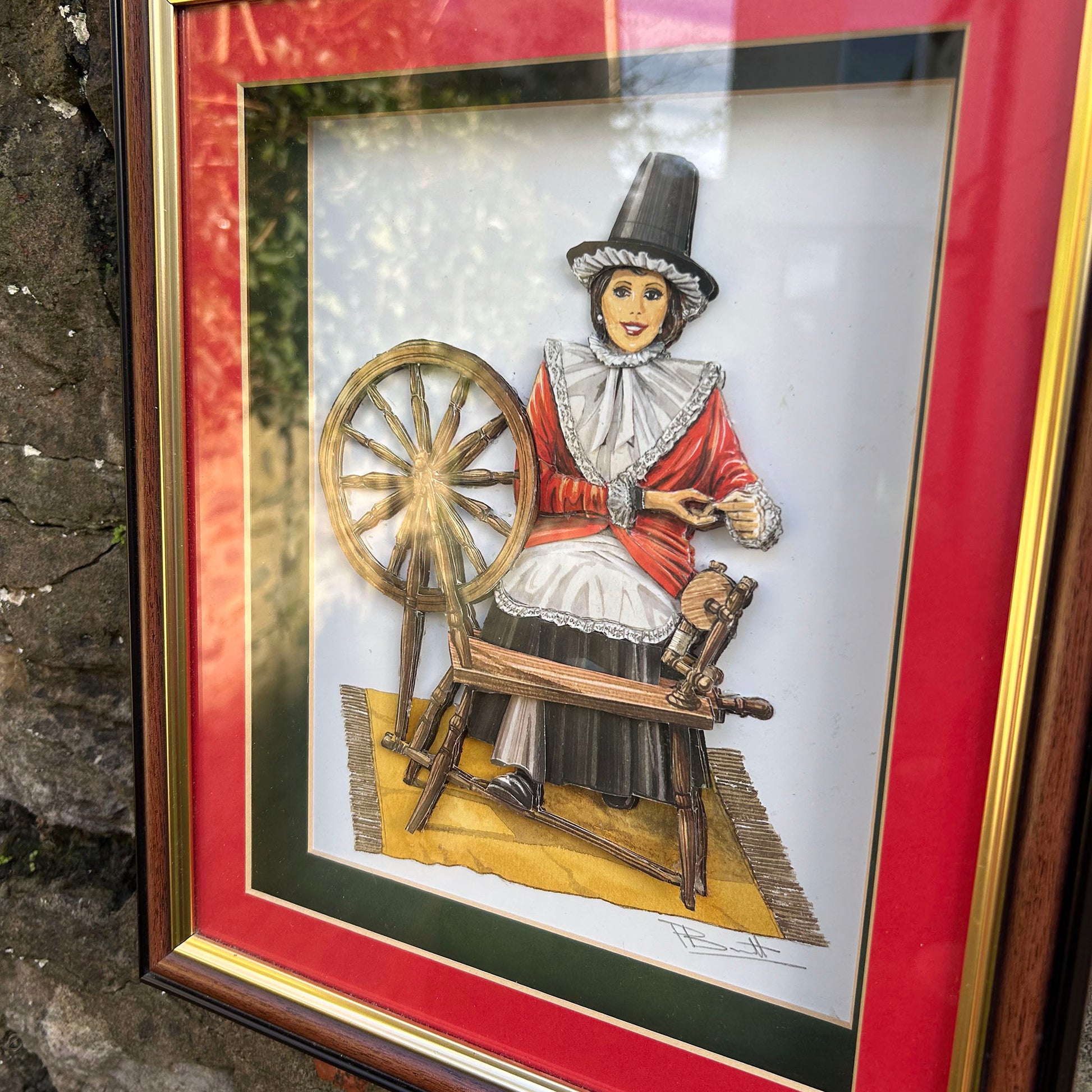 A beautifully detailed handcrafted shadow box depicting a traditional Welsh lady spinning wool at a spinning wheel. The scene is created in layered relief, giving a wonderful sense of depth and texture, with carefully formed elements bringing the figure, wheel and loom to life.