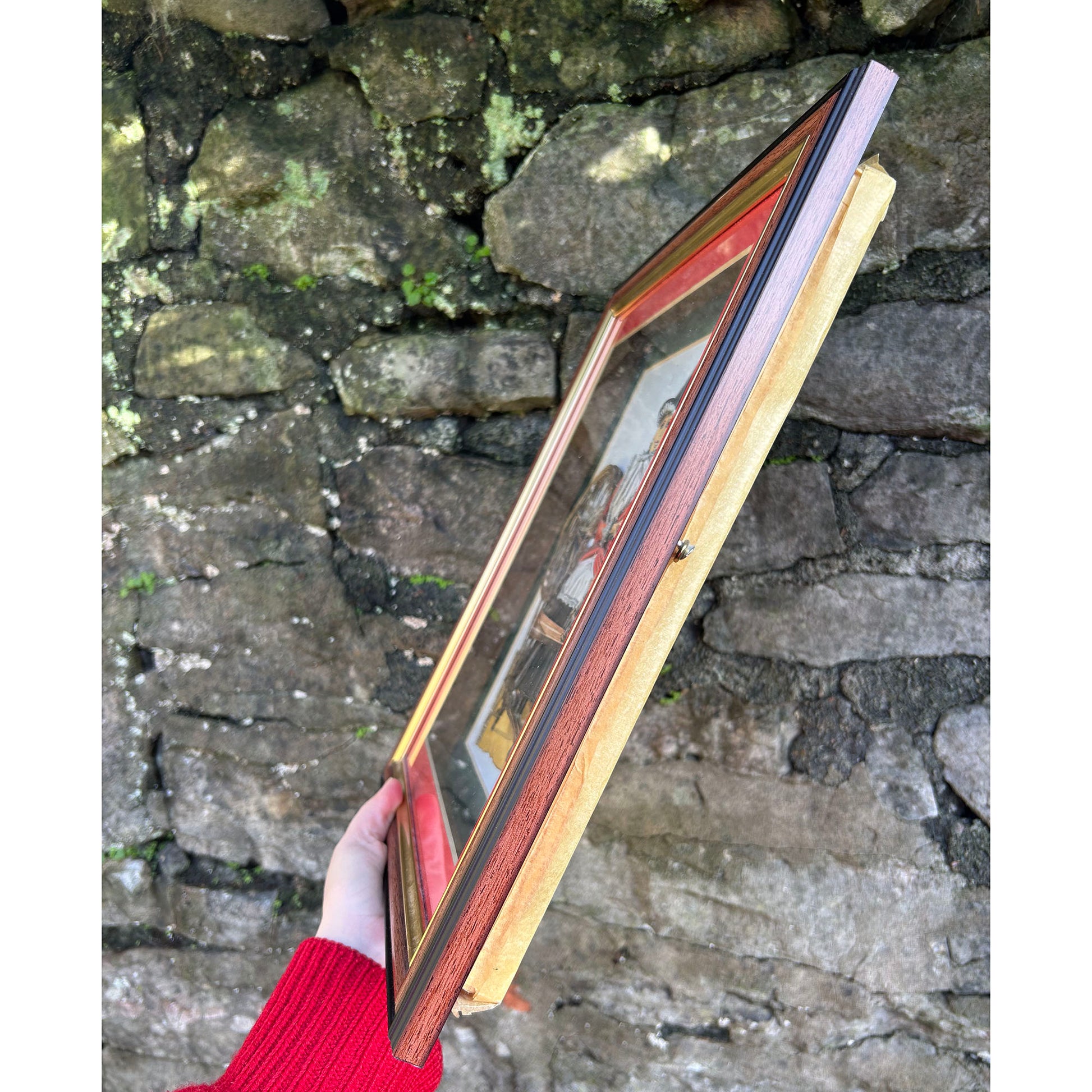 The piece is presented in a deep wooden frame with a bold red mount and gilt inner trim, which sets off the artwork beautifully and makes it an eye-catching display. The figure’s traditional dress and working pose evoke rural heritage and folk life, making this a particularly appealing piece for lovers of craft, history, or traditional interiors.