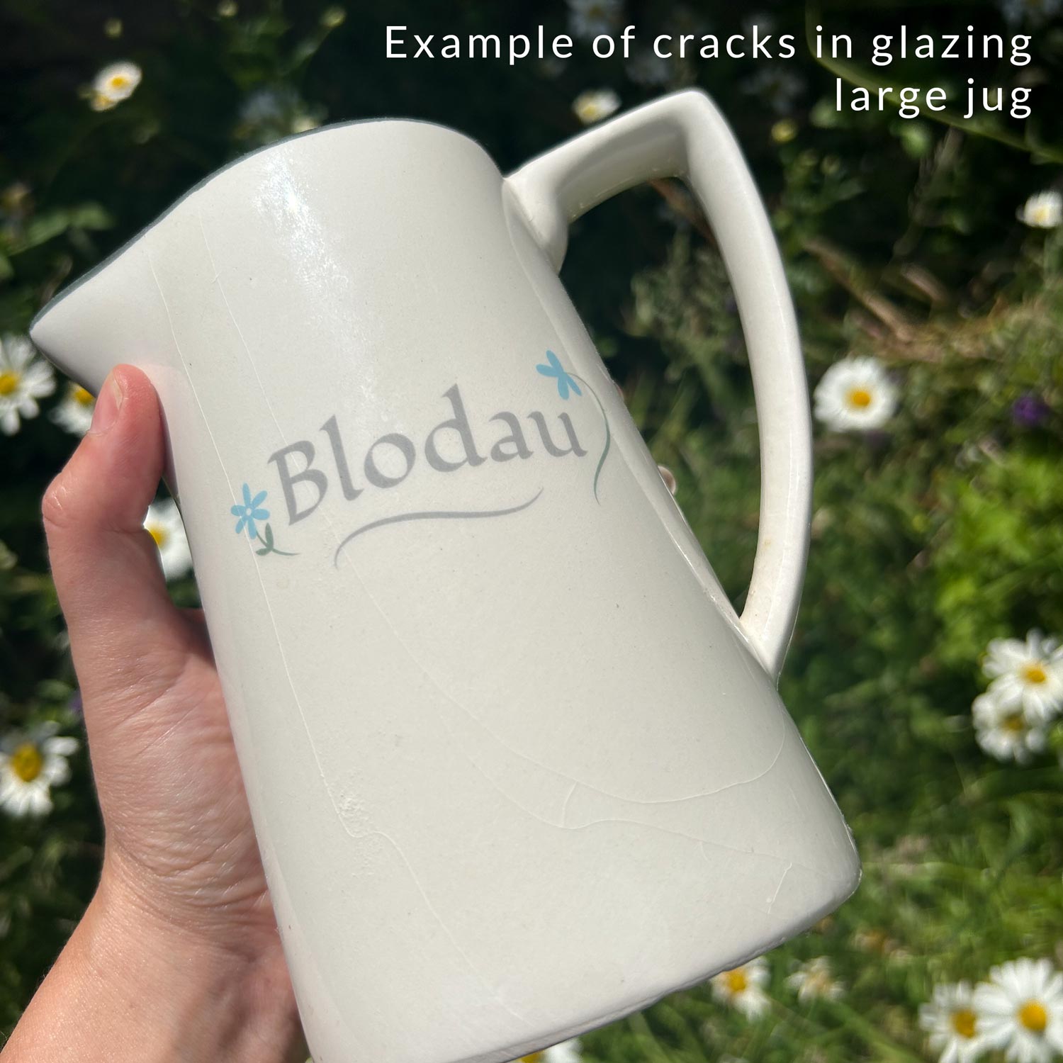 PLEASE NOTE: due to the distressed, hand-painted style of this item the text placement may differ slightly to the one pictured. The letters may have parts very slightly missing. The glazing also has hairline cracks to appear vintage (the jugs themselves have no cracks in them)
