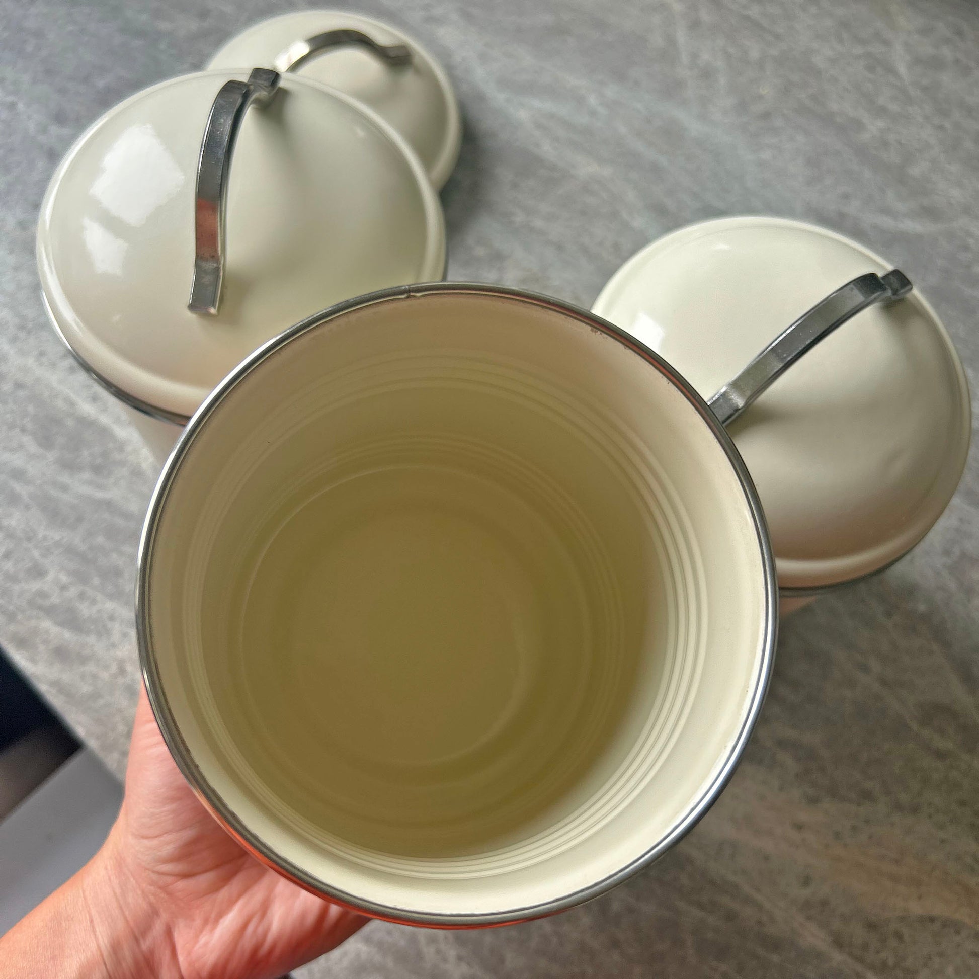 - In a lovely enamel cream with dark grey retro block writing and silver coloured handle