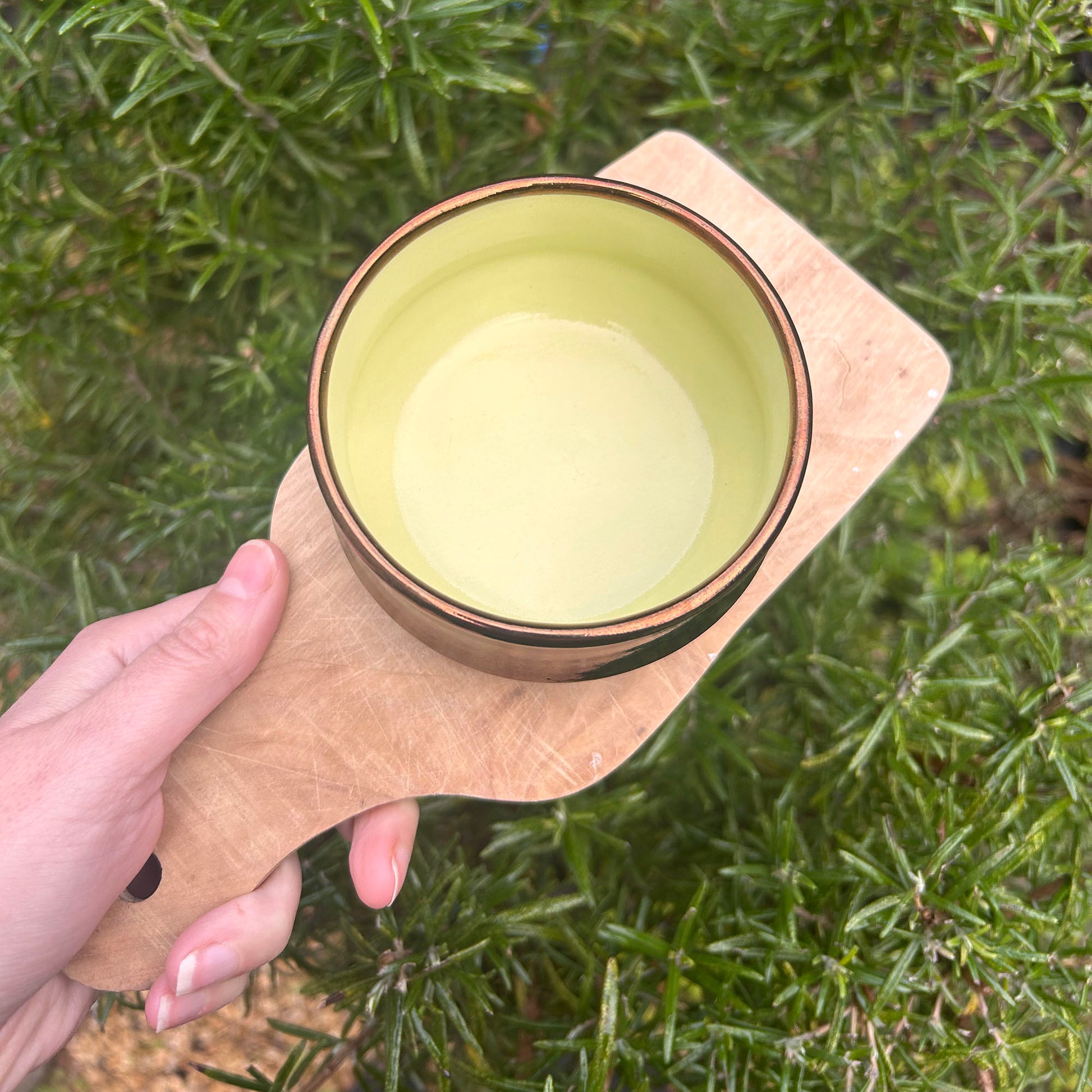 A beautiful little piece of Welsh studio pottery, made by Creigiau, Wales. This small bowl features a warm and rich copper lustre exterior with a soft, lime green yellow interior — a classic and very tactile combination that feels both rustic and refined.
