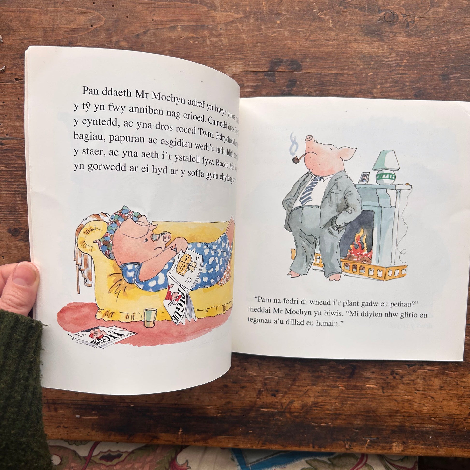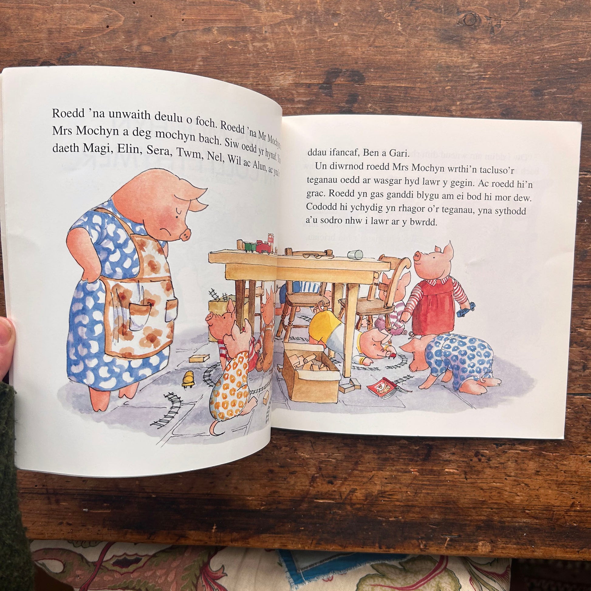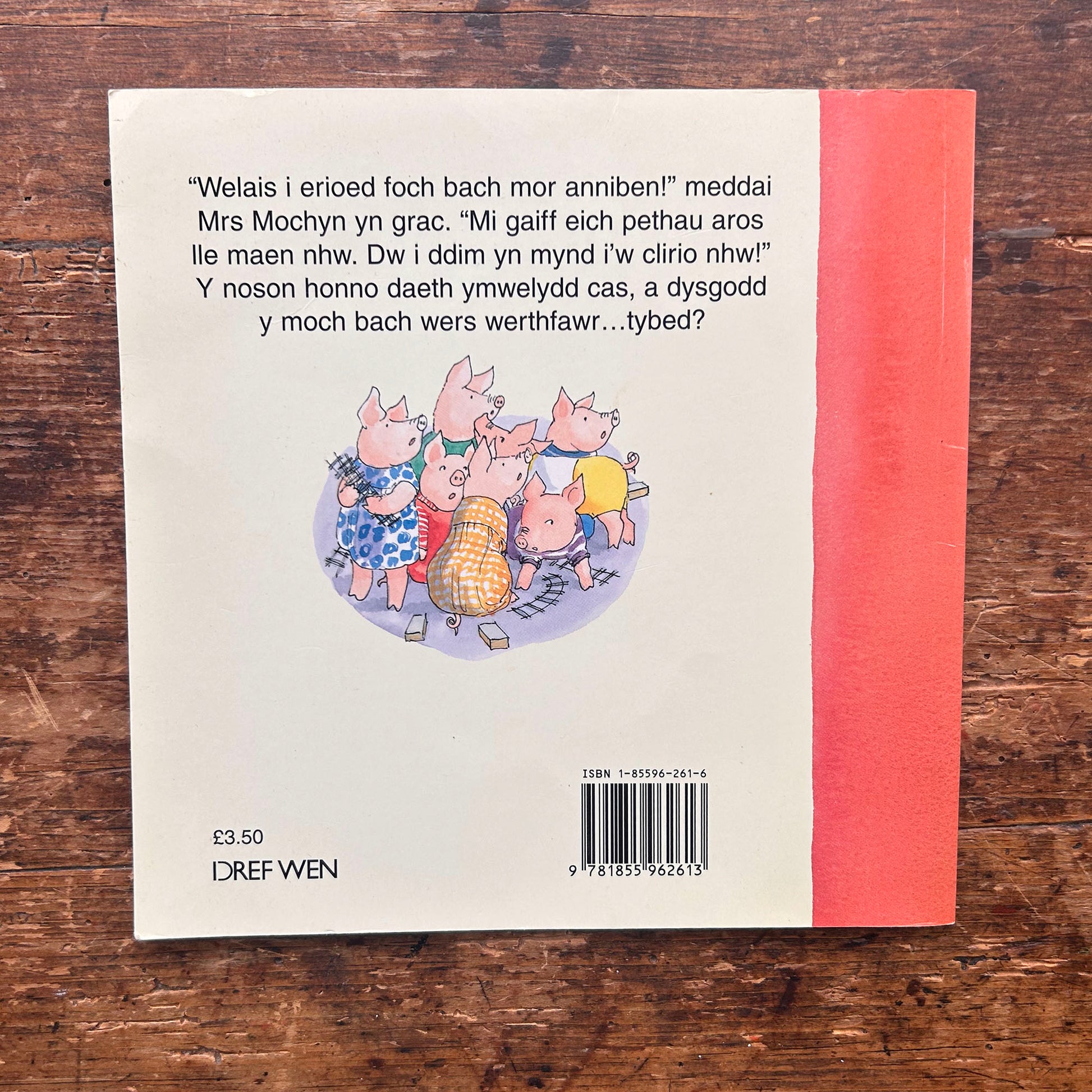 A Welsh adaptation of Mrs Pig Gets Cross, a colourfully illustrated story about ten untidy little pigs and the consequence of their untidiness.