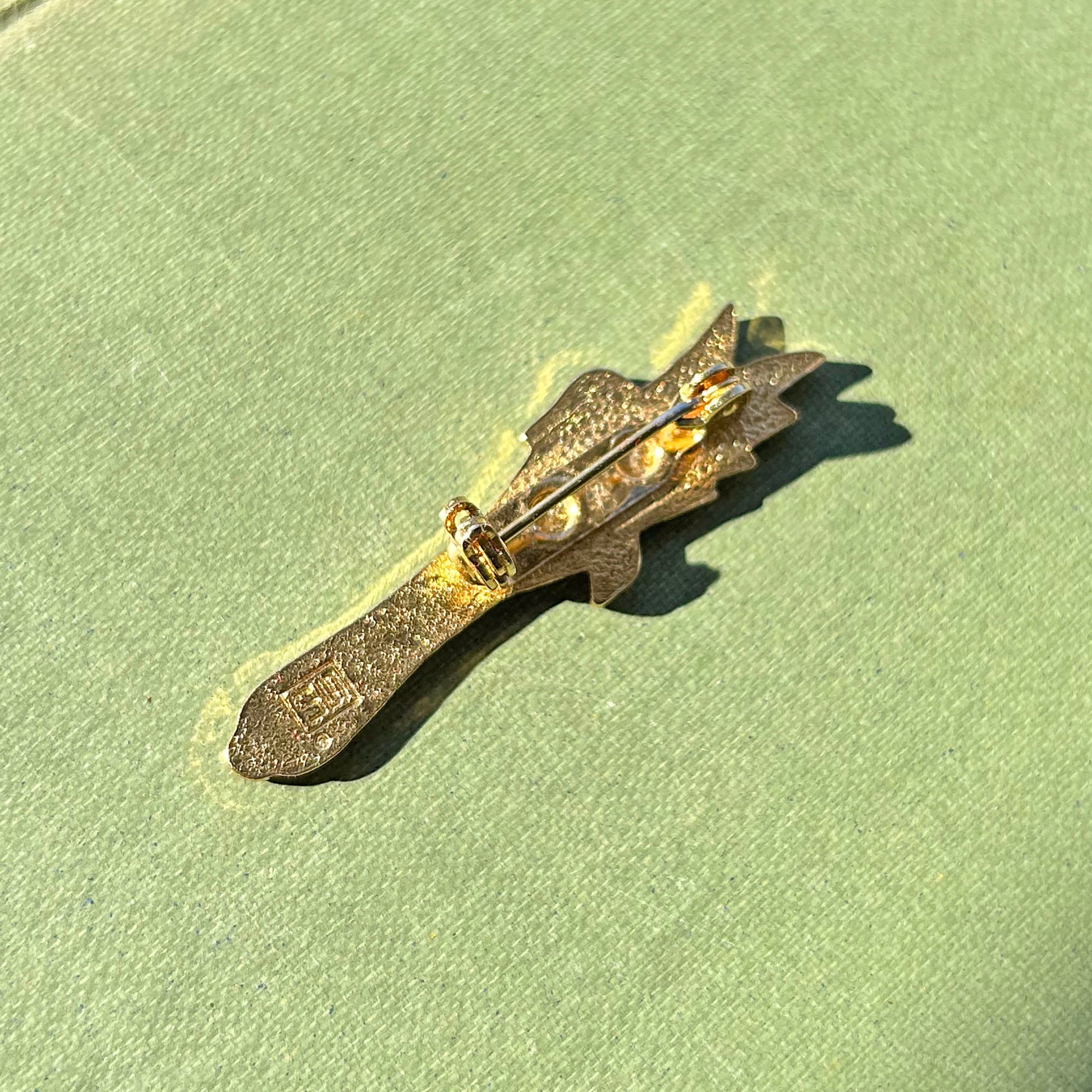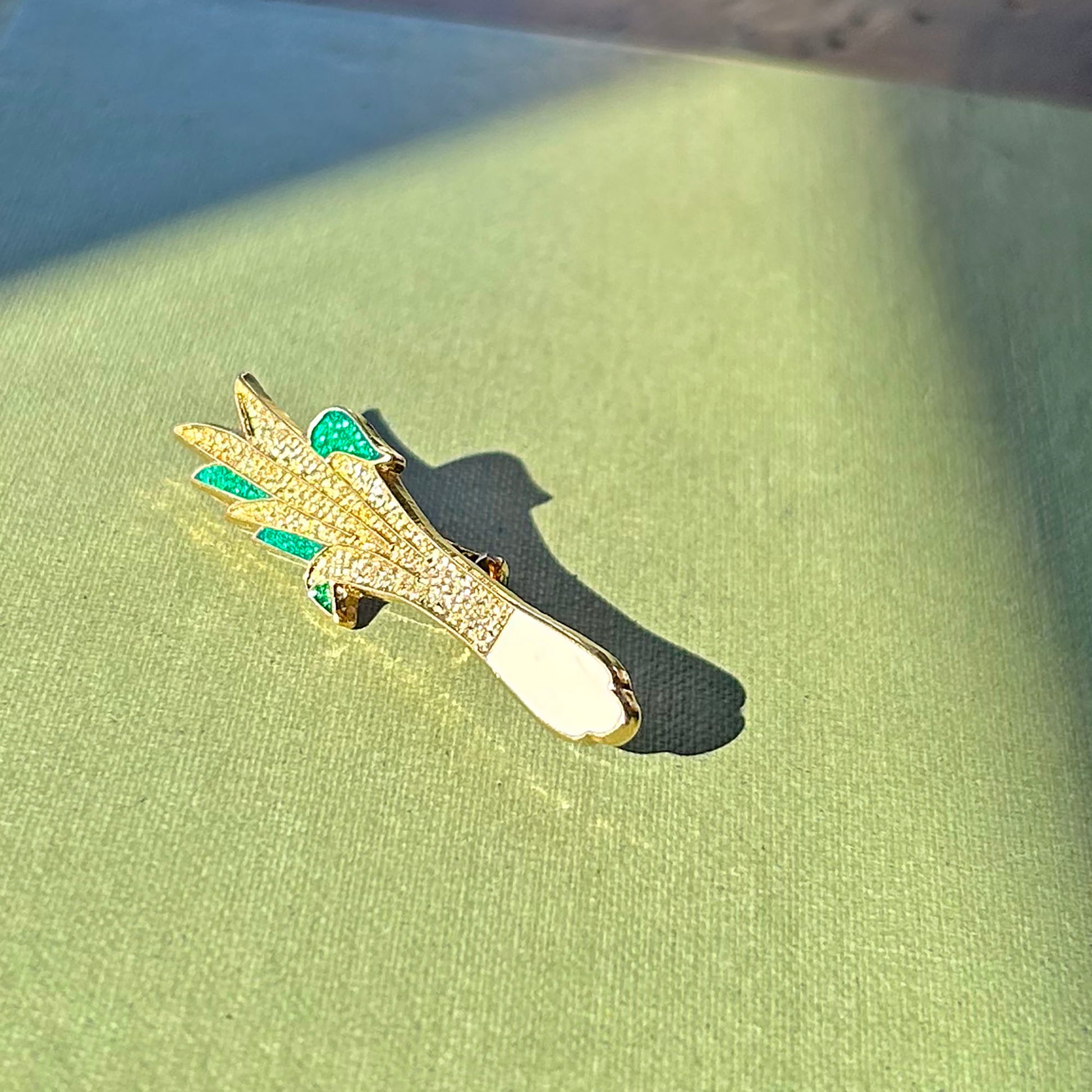 - Gold tone with green enamel detailing on the leaves and white on the stem