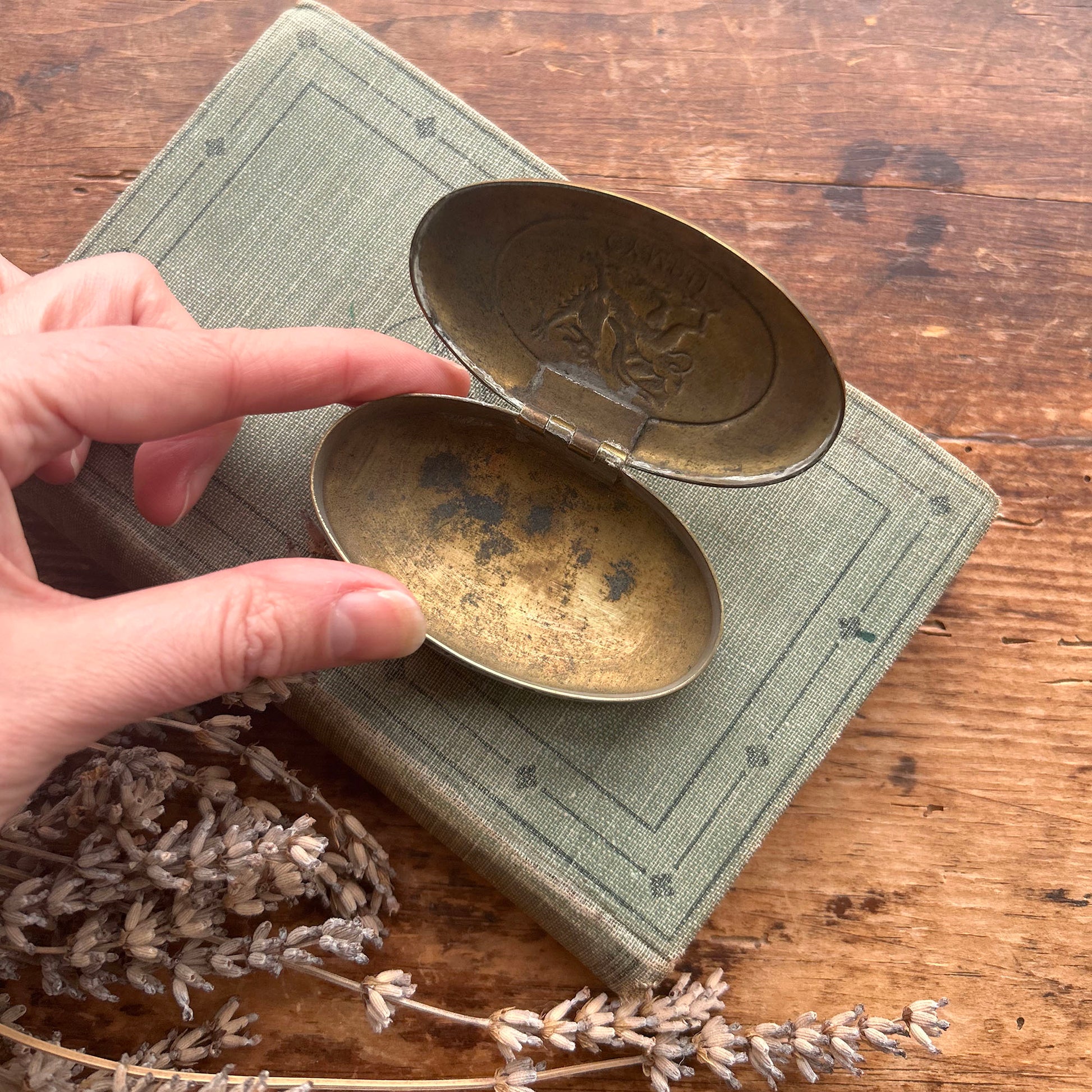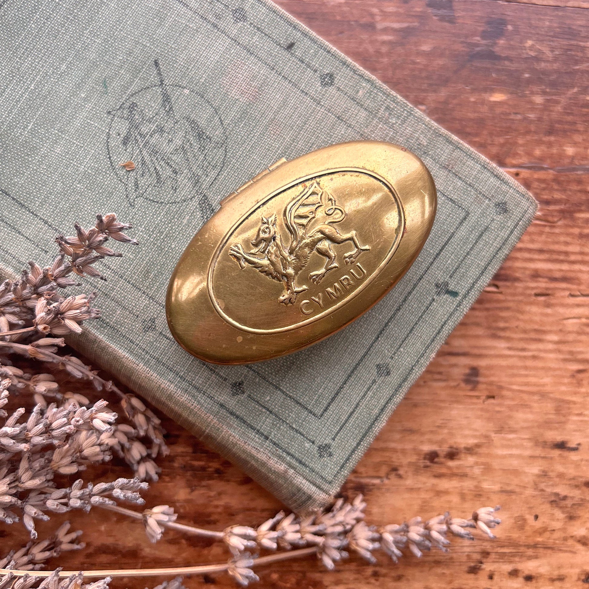 A charming vintage brass snuff / tobacco box, embossed with the Welsh dragon and the word Cymru (Wales). Oval in form and pleasingly weighty in the hand, this piece has the warm patina and gentle surface wear that comes from years of use.