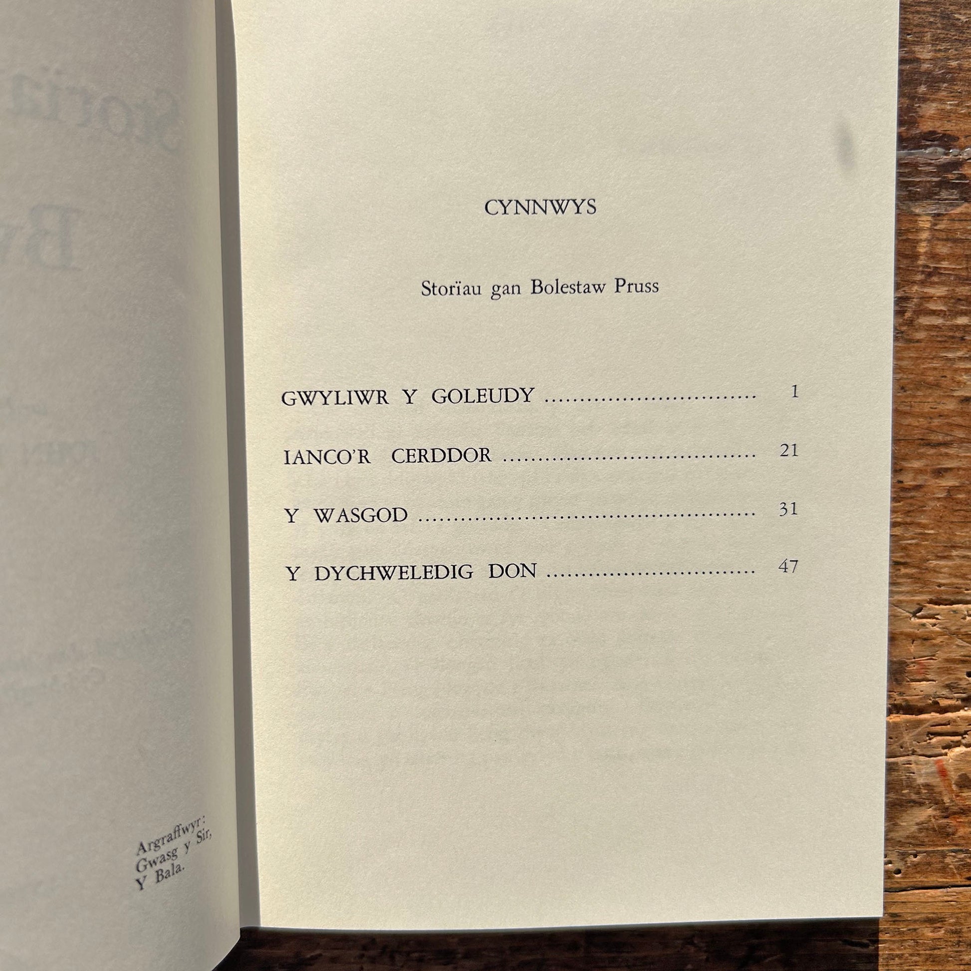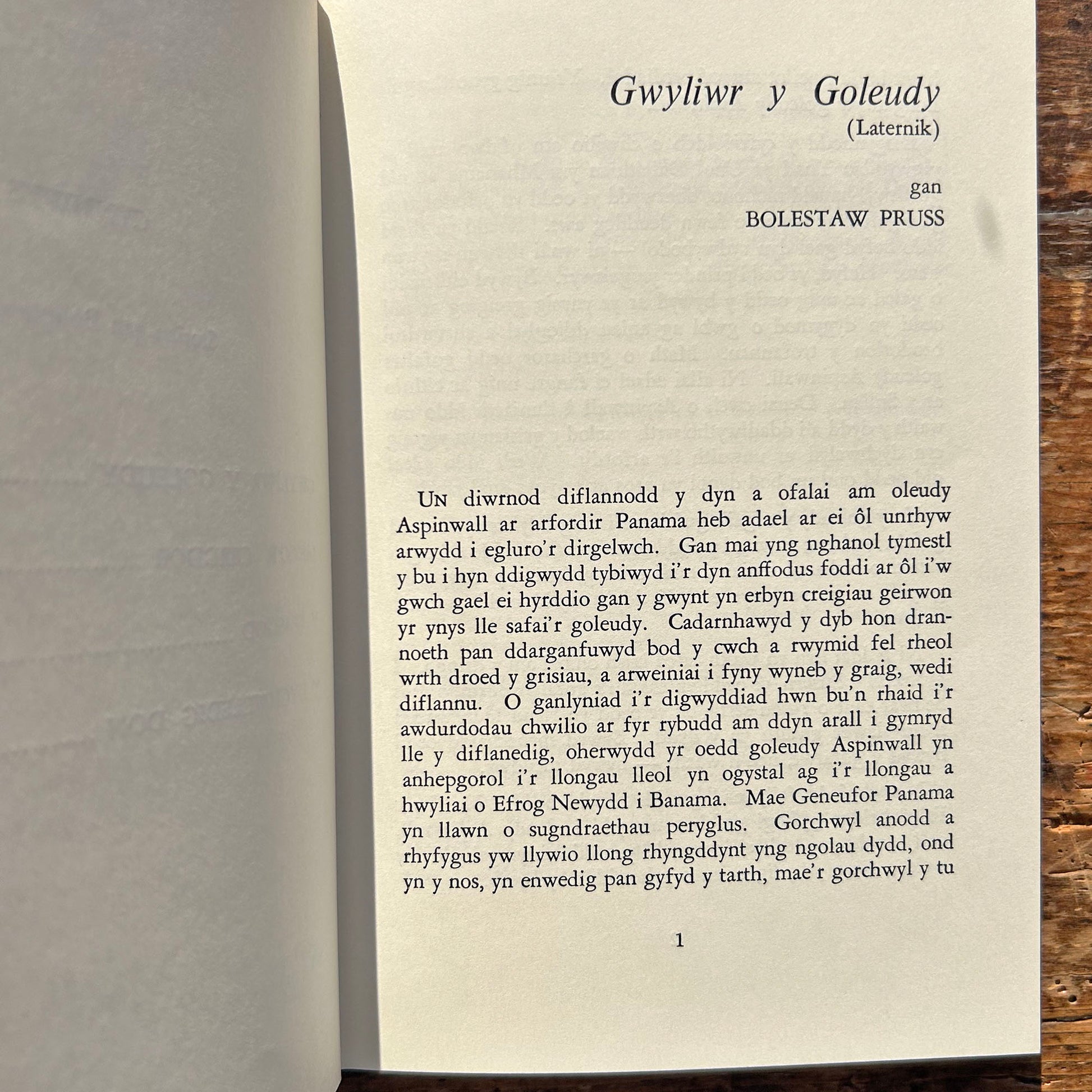 Includes Gwyliwr y Goleudy (Latarnik) and Ianco'r Cerddor (Janko Muzykant) by Henryk Sienkiewicz, Y Wasgod (Kamizelka) and Y Dychweledig Don (Powracająca fala) by Bolesław Prus.