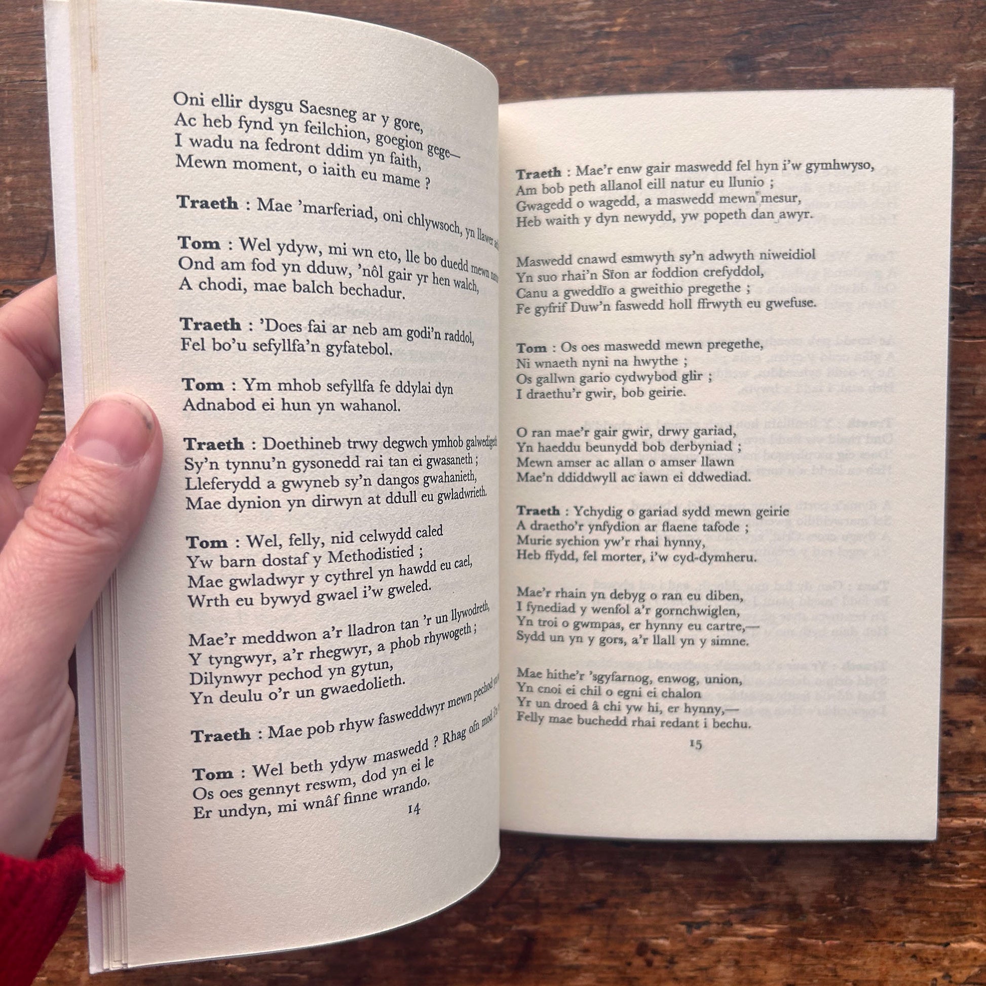 Twm o’r Nant (pen name of Thomas Edwards) was a renowned interlude and play writer. This particular interlude, ‘Tri Chryfion Byd’ or ‘Three Pillars of the World’ was one of his most popular. Poverty, Love and Death, the three pillars, are personified by Twm o’r Nant, and all preach, narrate, advise and commentate during the course of this humorous and lively play.
